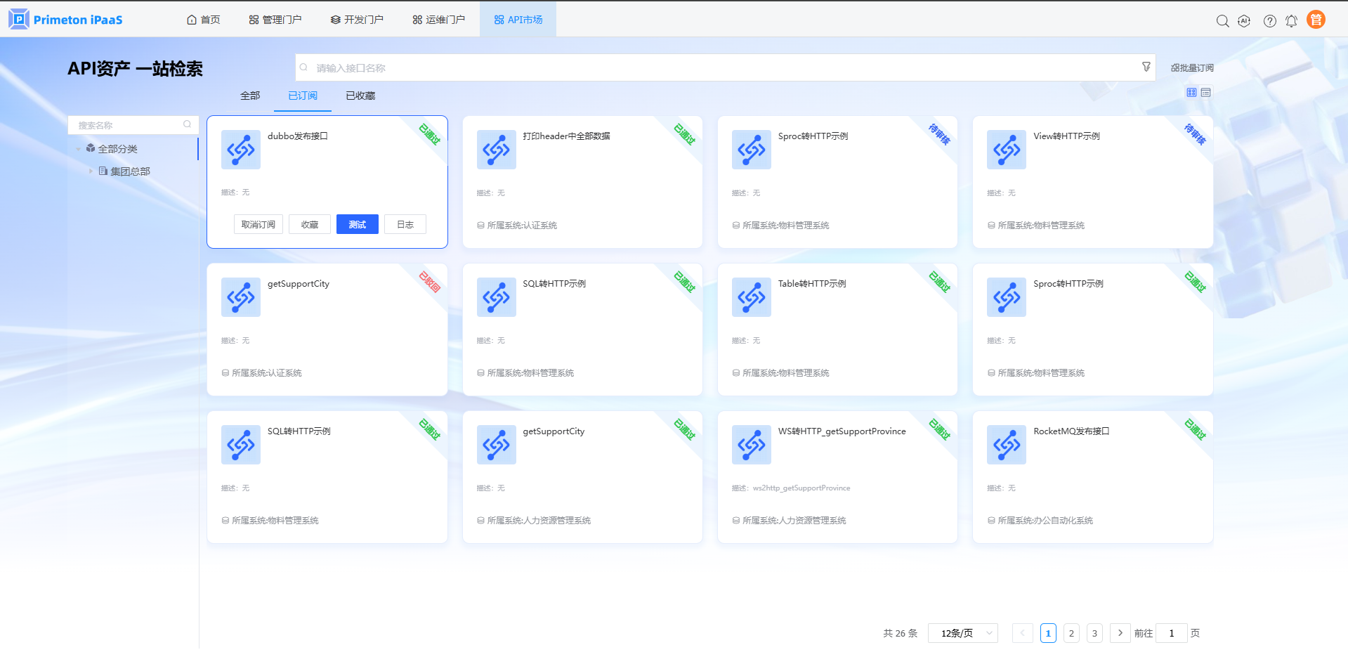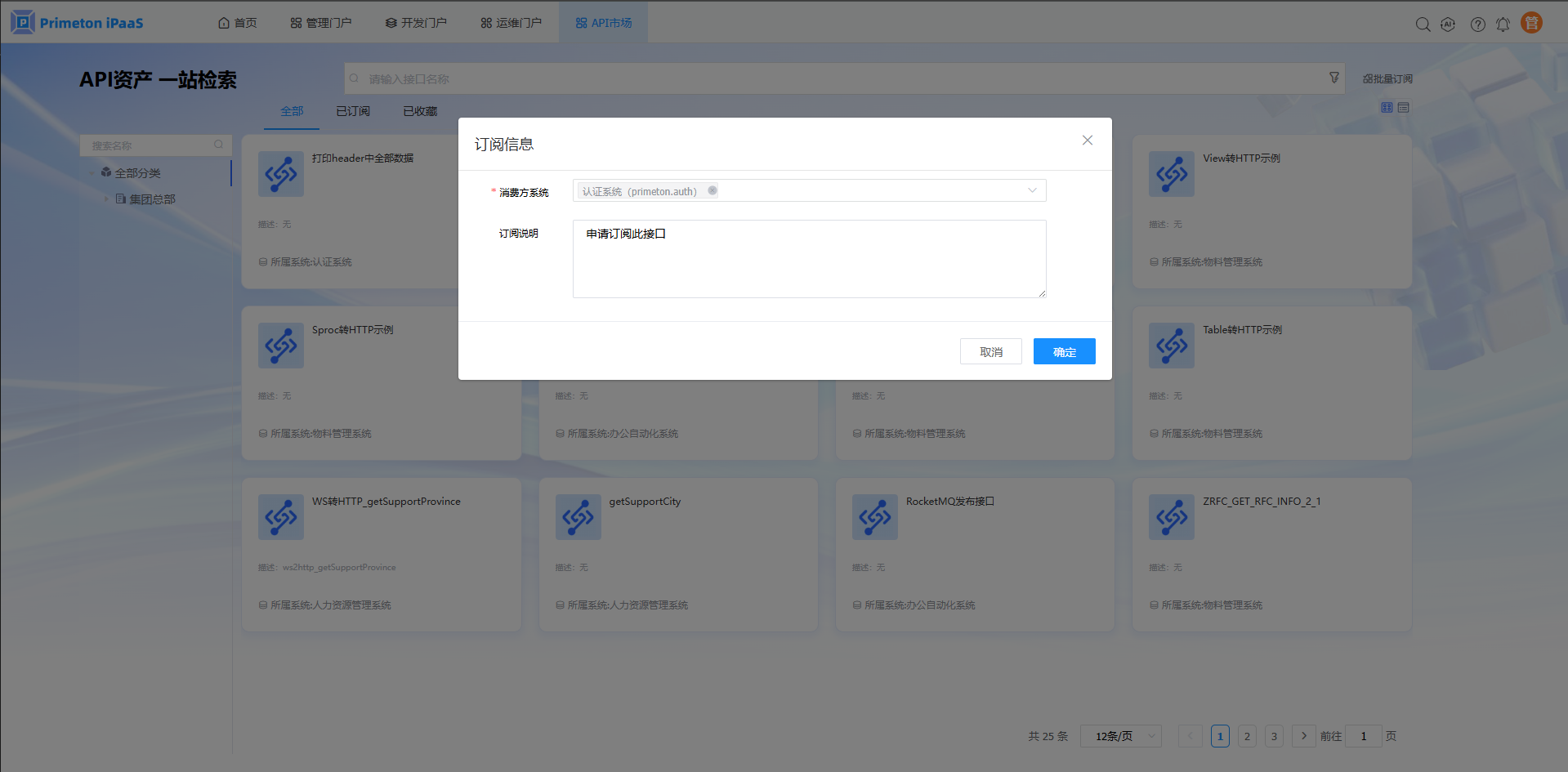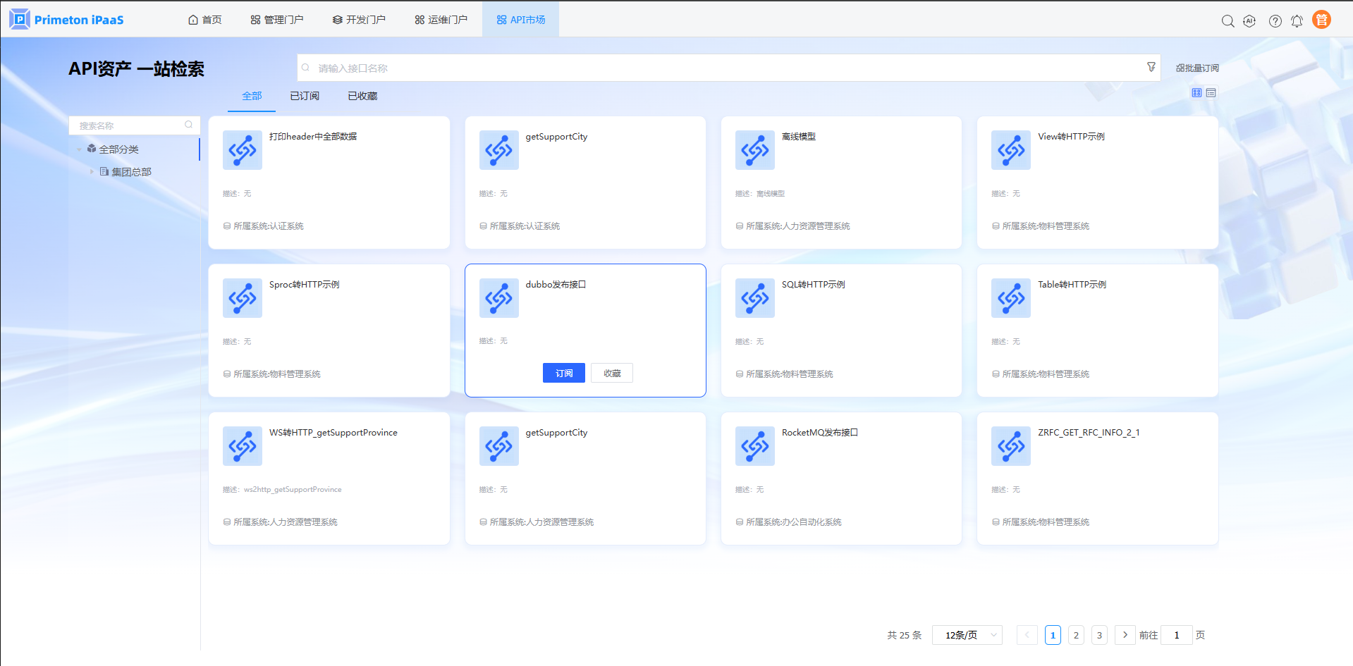 1.使用manager账号(默认密码:000000)登录系统,点击“API市场”,进入”全部“页签。