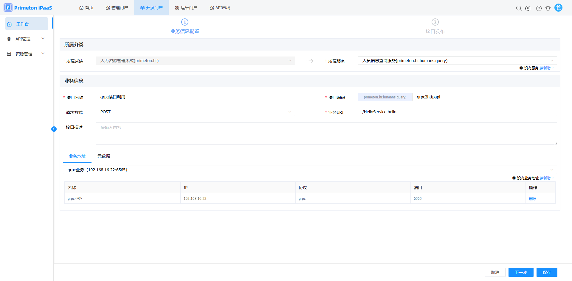 3.“API快速发布“弹窗,选择”gRPC“页签,点击”gRPC转HTTP“按钮,进入”gPRC转HTTP“接口发布页面。
