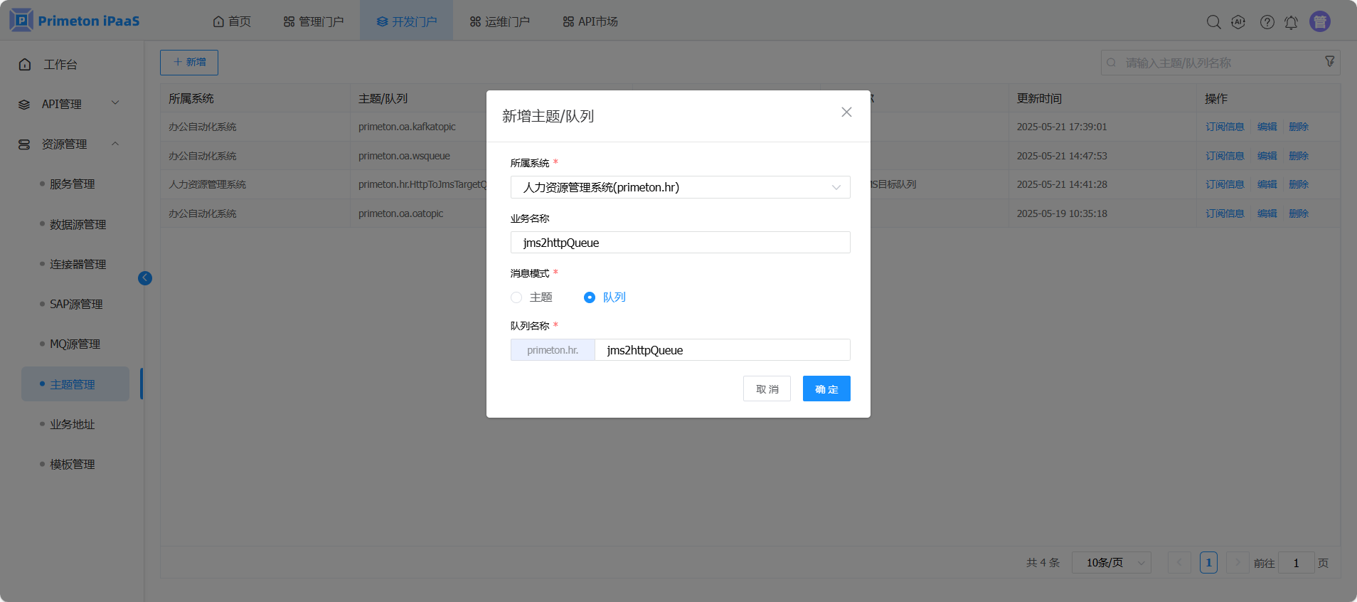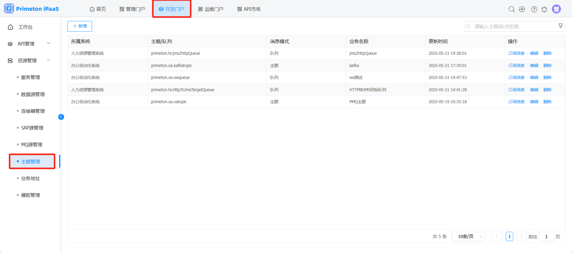 1. 使用manager账号(默认密码:000000)登录系统,点击开发门户,进入“资源管理”>“主题管理”页面。