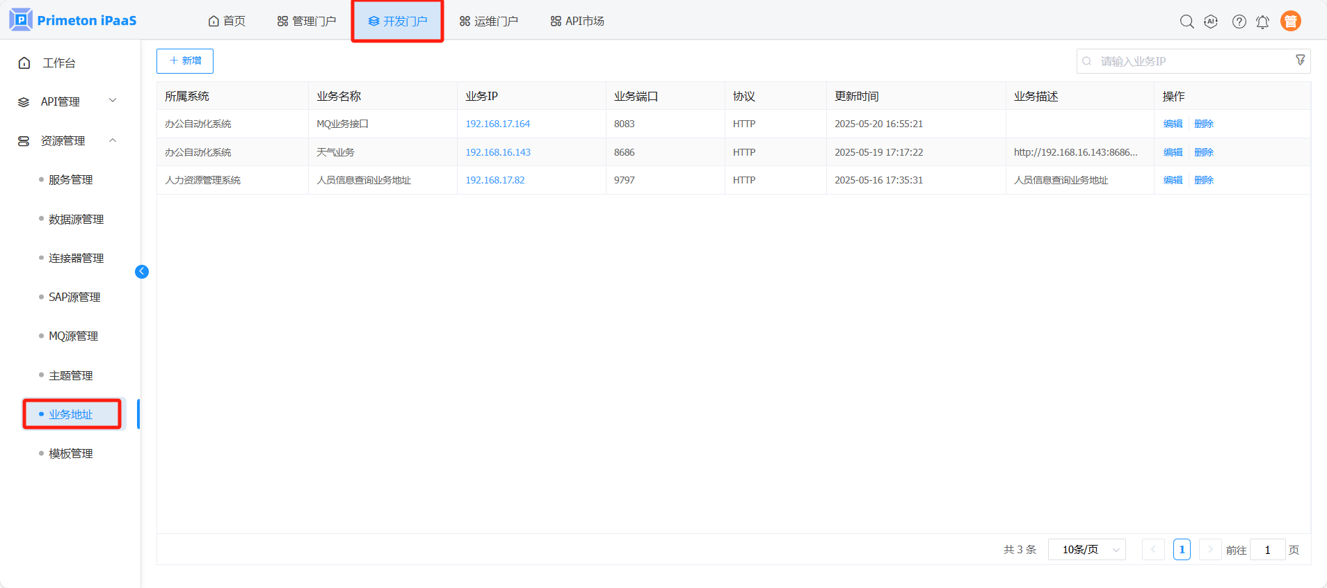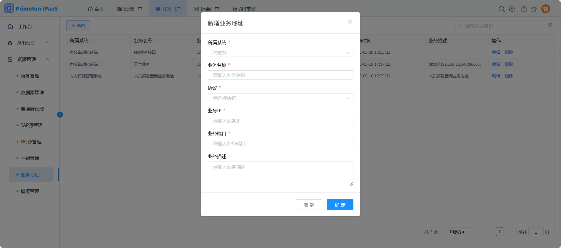 2. 使用manager账号(默认密码:000000)登录系统,点击开发门户,进入"资源管理">"业务地址"页面,