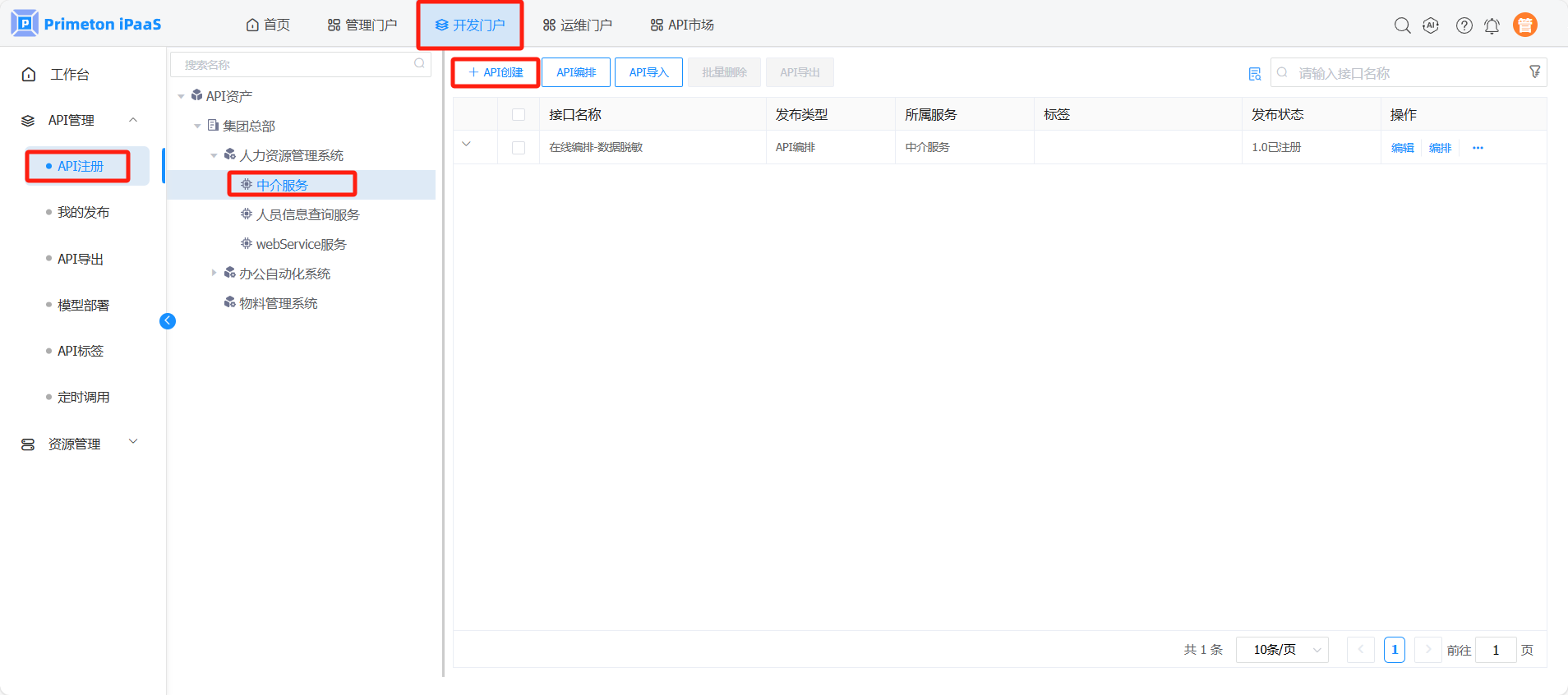 1. 使用manager账号(默认密码:000000)登录系统,点击开发门户,进入“API管理”>“API注册”页面。在左侧资源树选择“中介服务”项,右侧界面点击“API创建”按钮,弹出“API创建”页面。