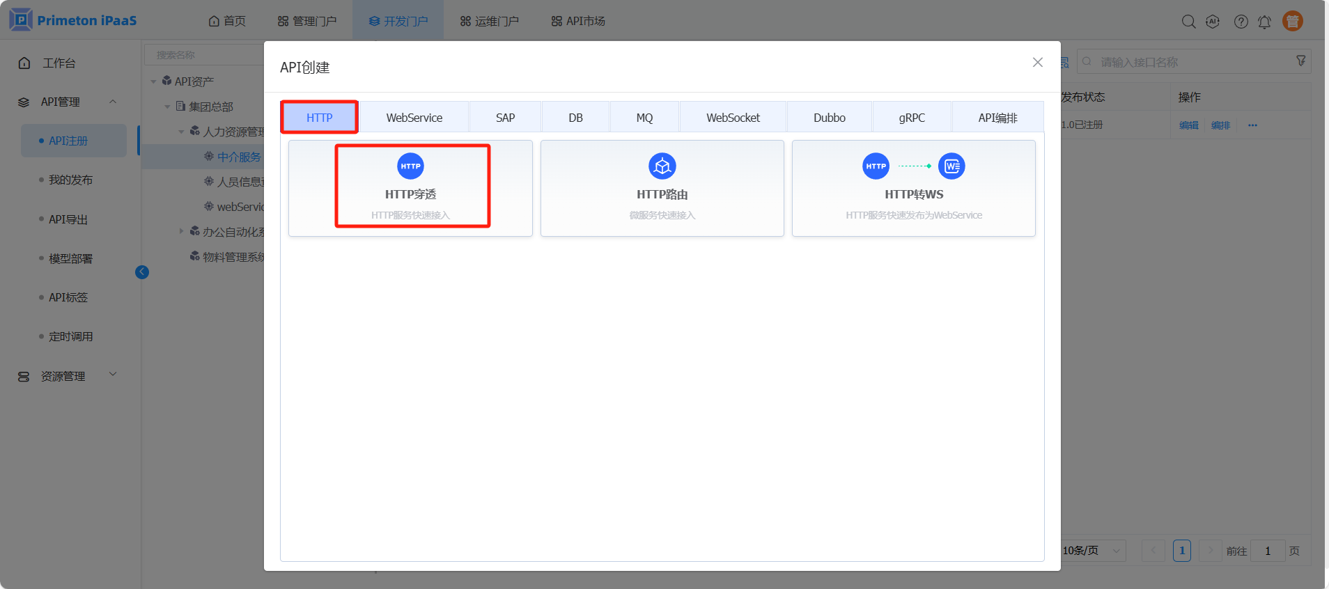 2. 在“API创建”页面,点击“HTTP”页签,选择“HTTP穿透”类型。