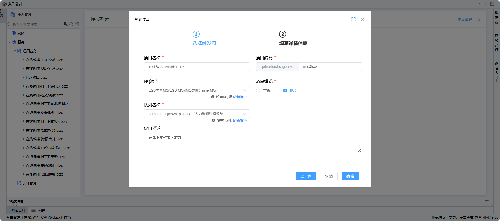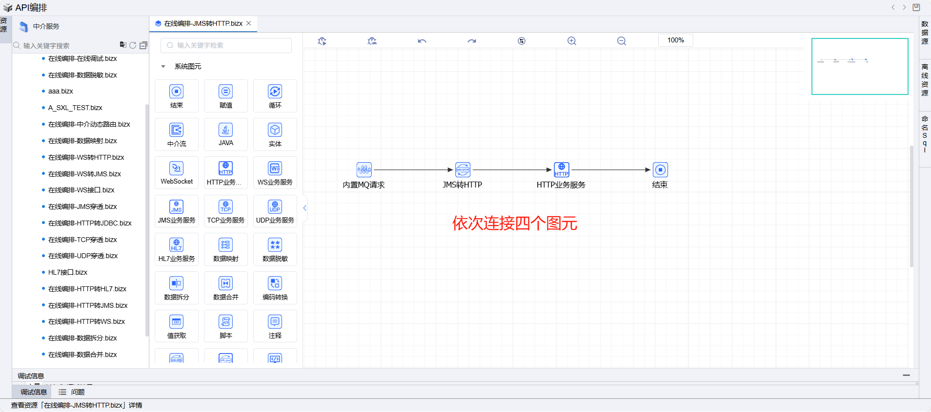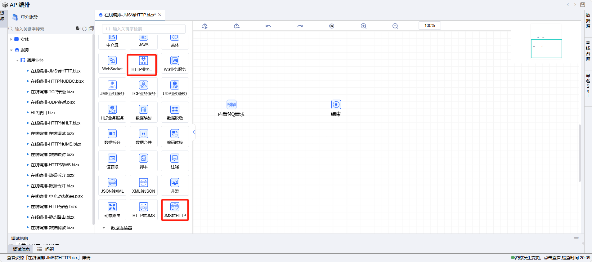 1. 保存成功后系统自动打开中介编排页面。从左侧拖 JMS转HTTP 和 HTTP业务服务 图元到编辑区域。