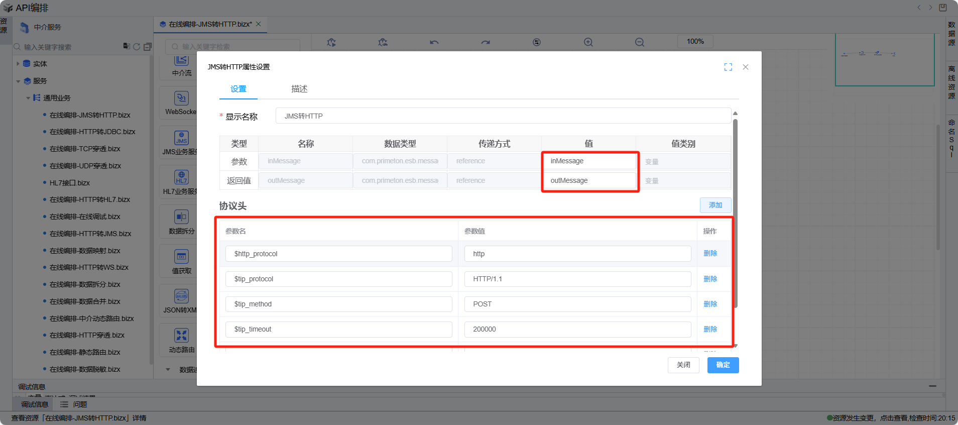 3. 双击打开JMS转HTTP图元,填写 参数 与 返回值 及 协议头(协议头此次场景不修改) 信息,点击确定。如下图: