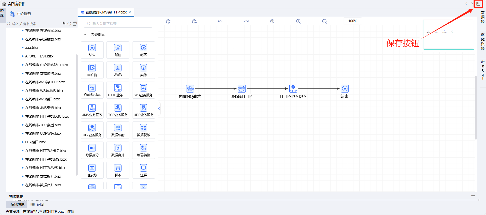 1. 选择左侧树上“中介服务”节点,点击右侧“API编排”按钮,进入在线编排页面。
