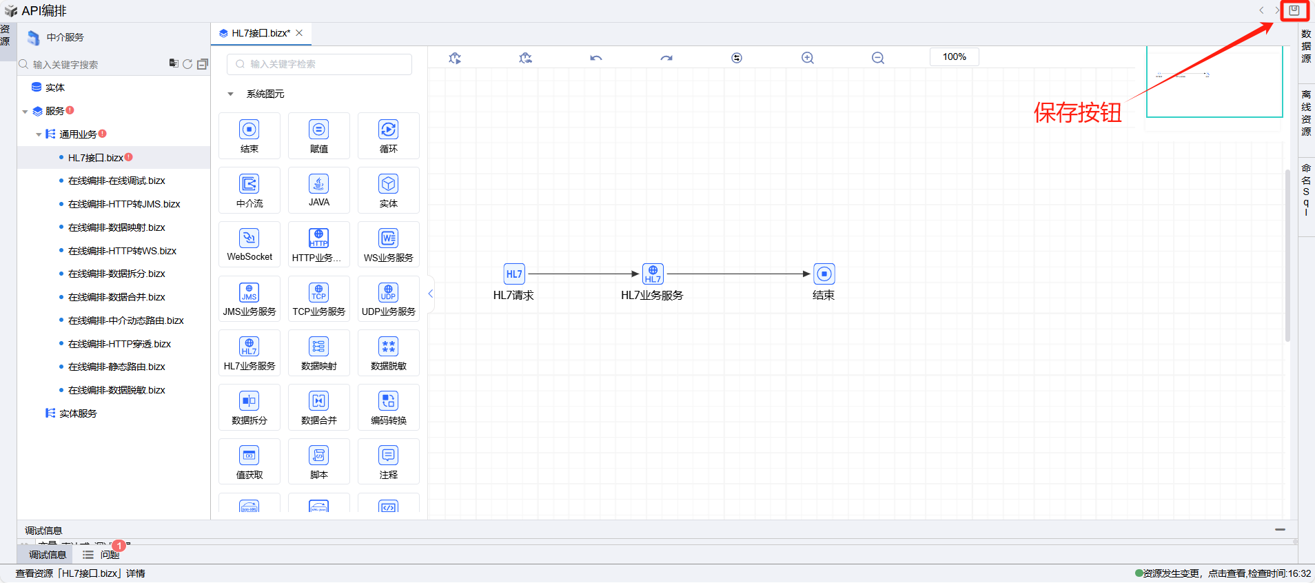 保存成功后系统自动打开中介编排页面,如下图所示。从左侧拖一个HL7业务服务图元到编辑区域。
