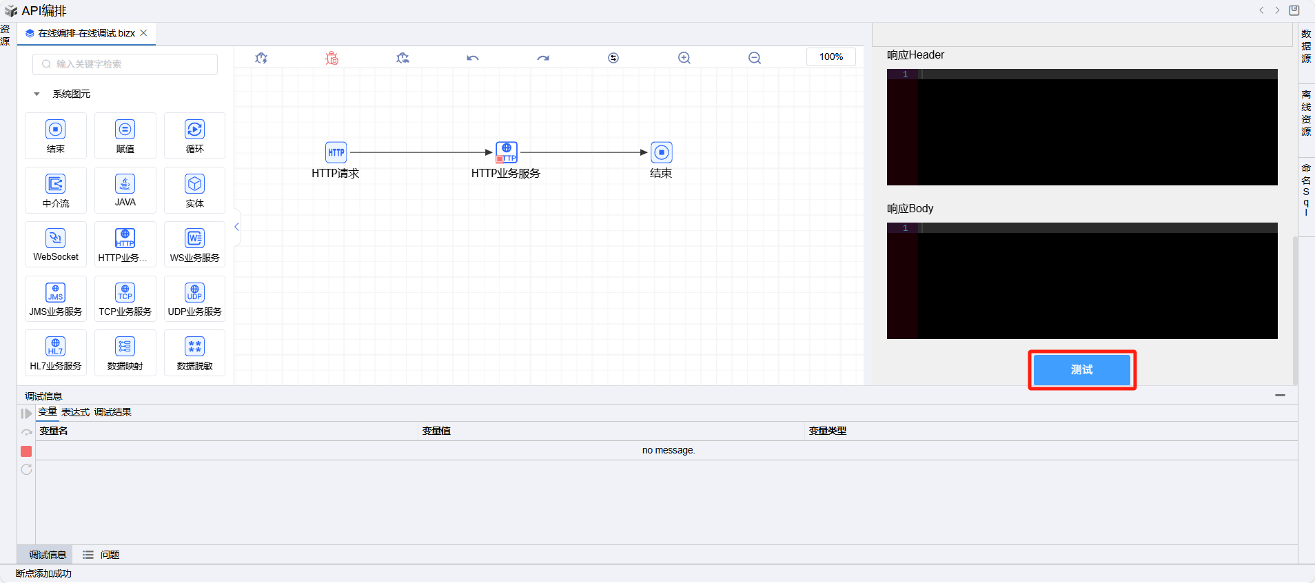 点击测试后,可以看到在线编排页面,已经来到第一个断点,可在“变量”界面查看当前变量信息。