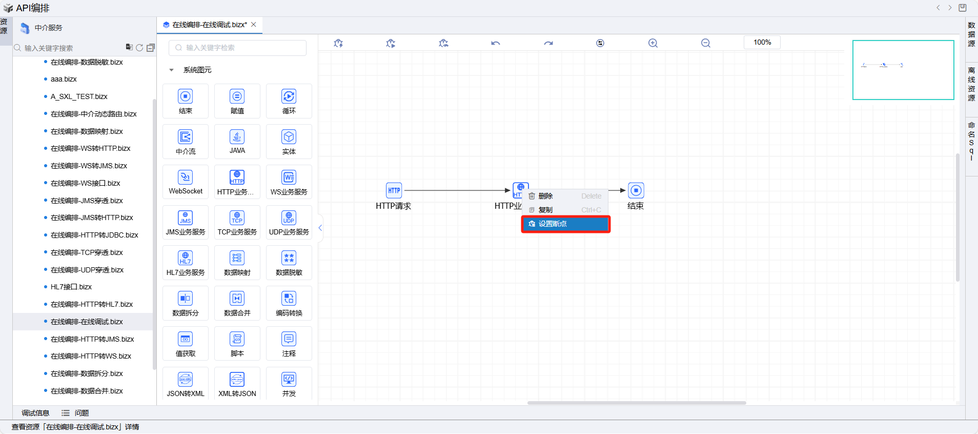 在 HTTP业务服务 图元上点击鼠标右键,点击“设置断点”。