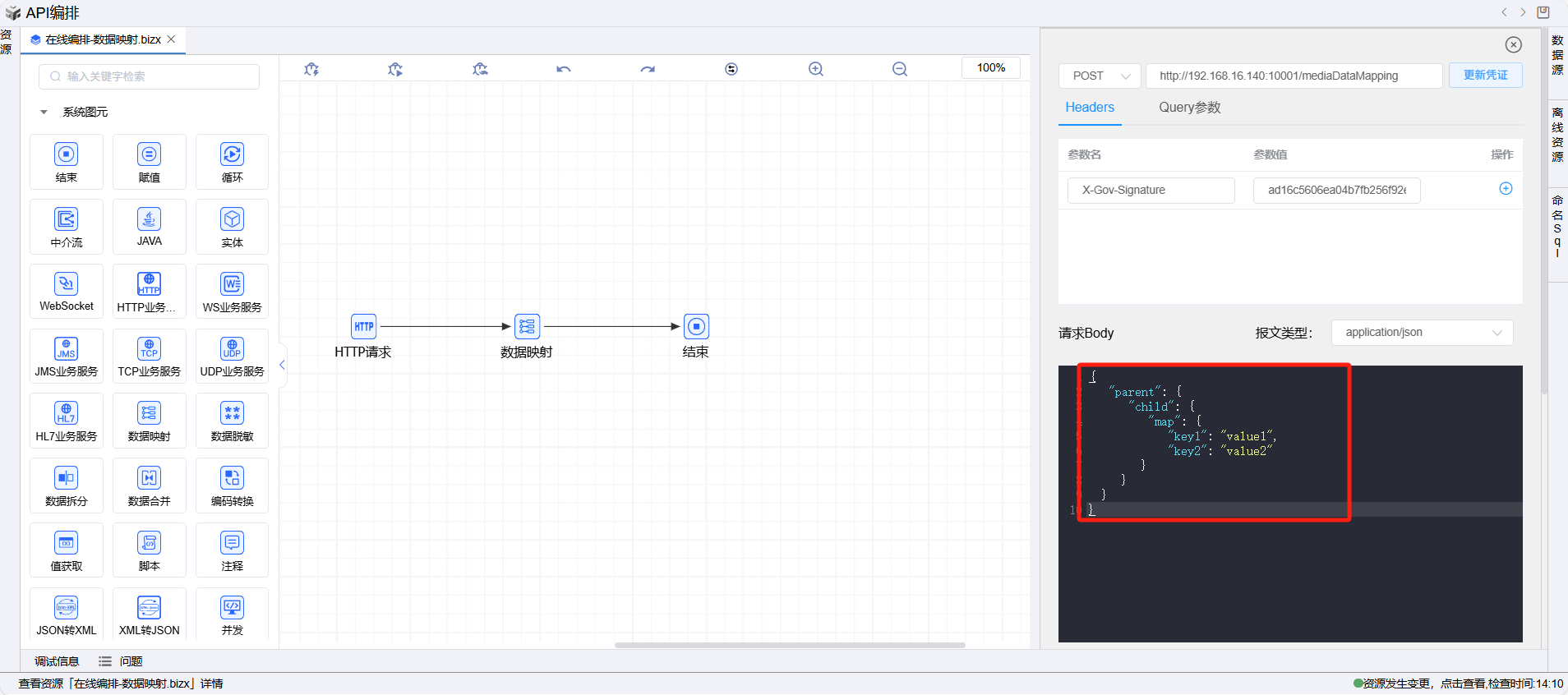 在线编排页面保存成功后,点击界面上方的测试按钮,如下图: