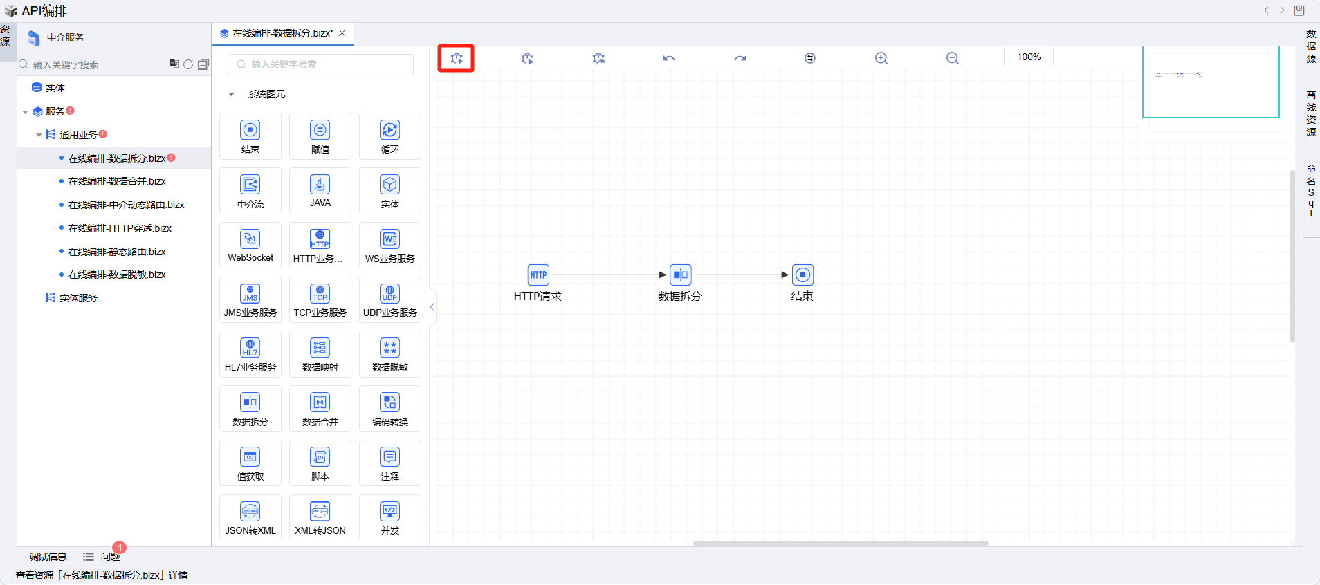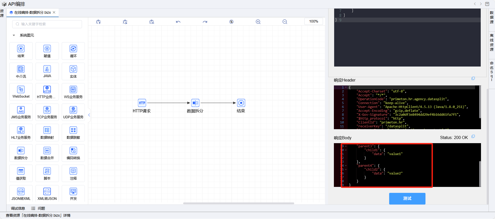 在线编排页面保存成功后,点击界面上方的测试按钮,如下图: