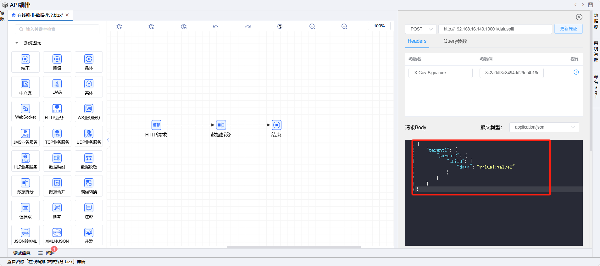 打开测试对话框,body体填写拆分前原报文格式文件的内容。如下: