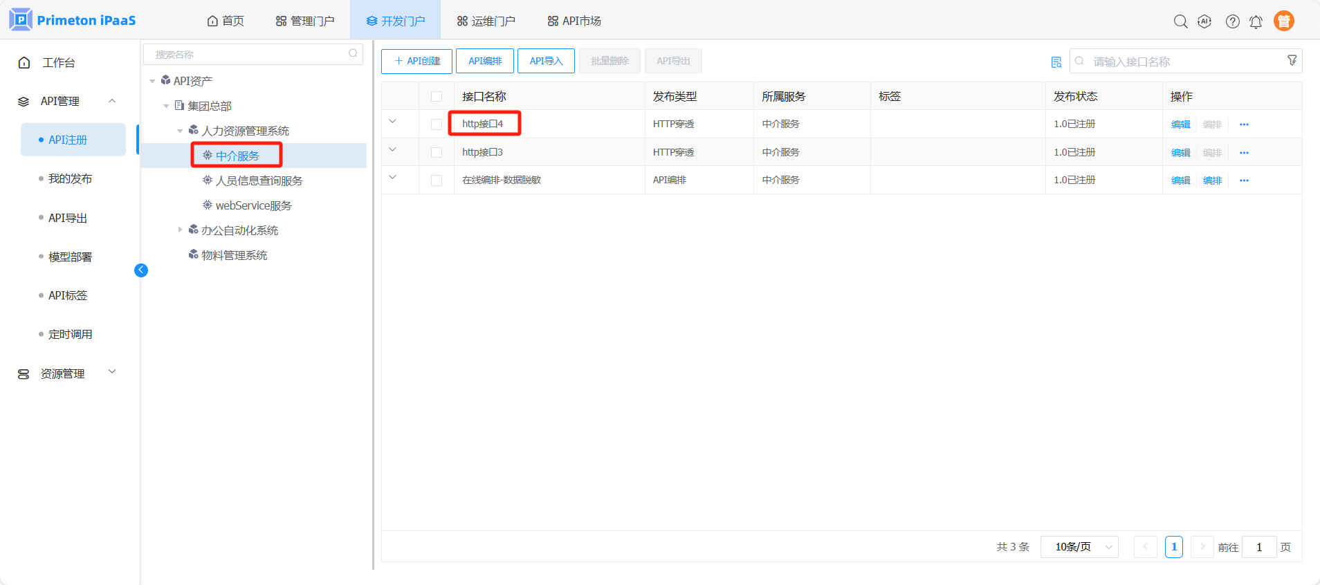 参数 说明 所属系统 API所属系统 所属服务 API所属服务, 导入方式 业务接口信息导入方式,此处选择“手动录入”选项 接口名称 业务接口名称 此处填写 http接口3 接口编码 业务接口编码 此处体系 httpDemo3 请求方式 业务请求方式:GET、POST、DELETE、PUT、PATCH 此处选择 POST 业务URI 业务接口URL路径,例如:/test或/api/test 此处填写 /hello3/hello3 接口描述 业务接口描述 业务地址 业务服务地址信息,此处选择 新建HTTP业务地址 新增的业务地址 进入“API管理”>“API注册”页面,可查看上步骤创建的“http接口3”业务接口记录。