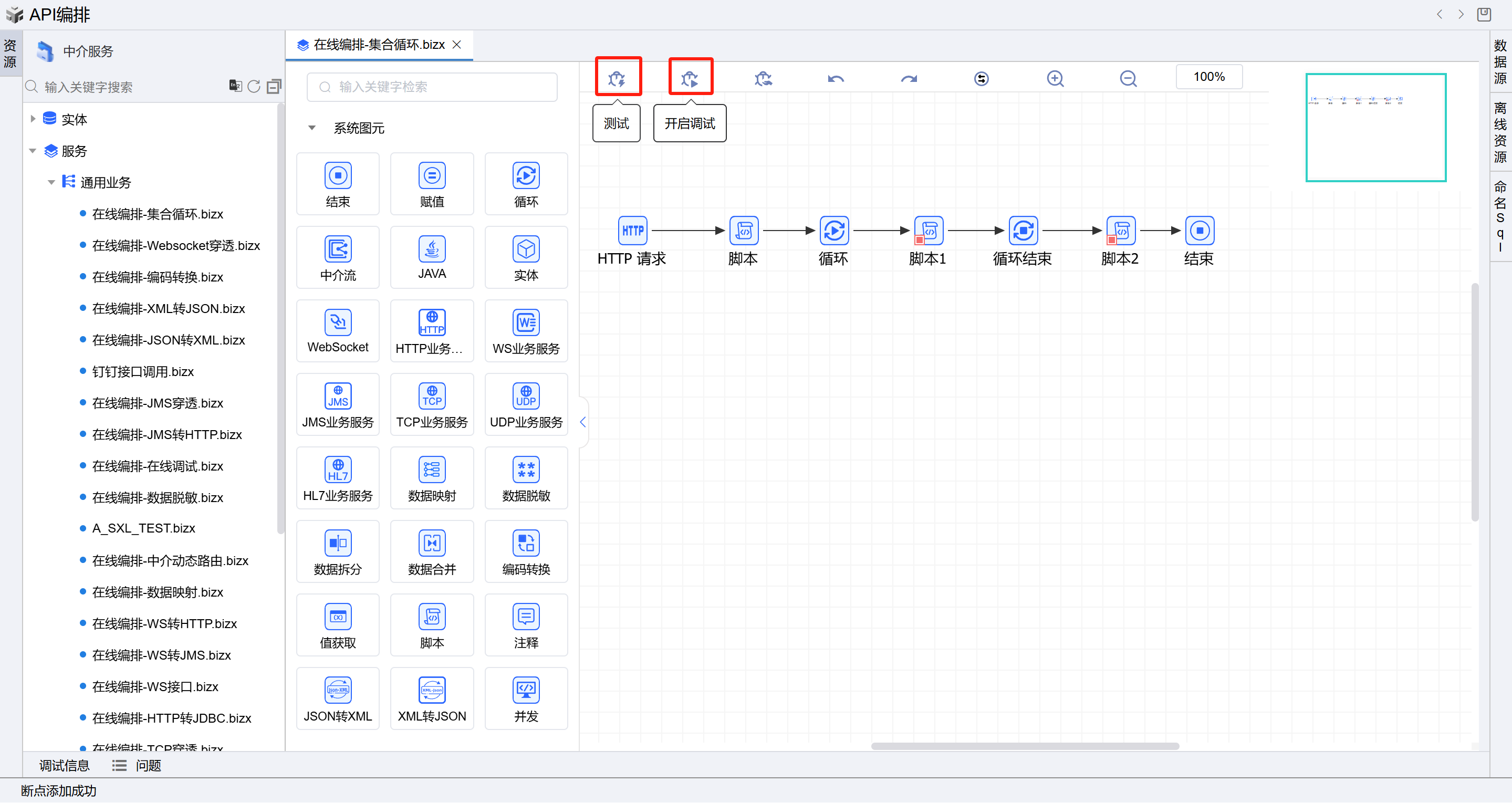 先点击开启调试按钮,在点击测试按钮,如下图: