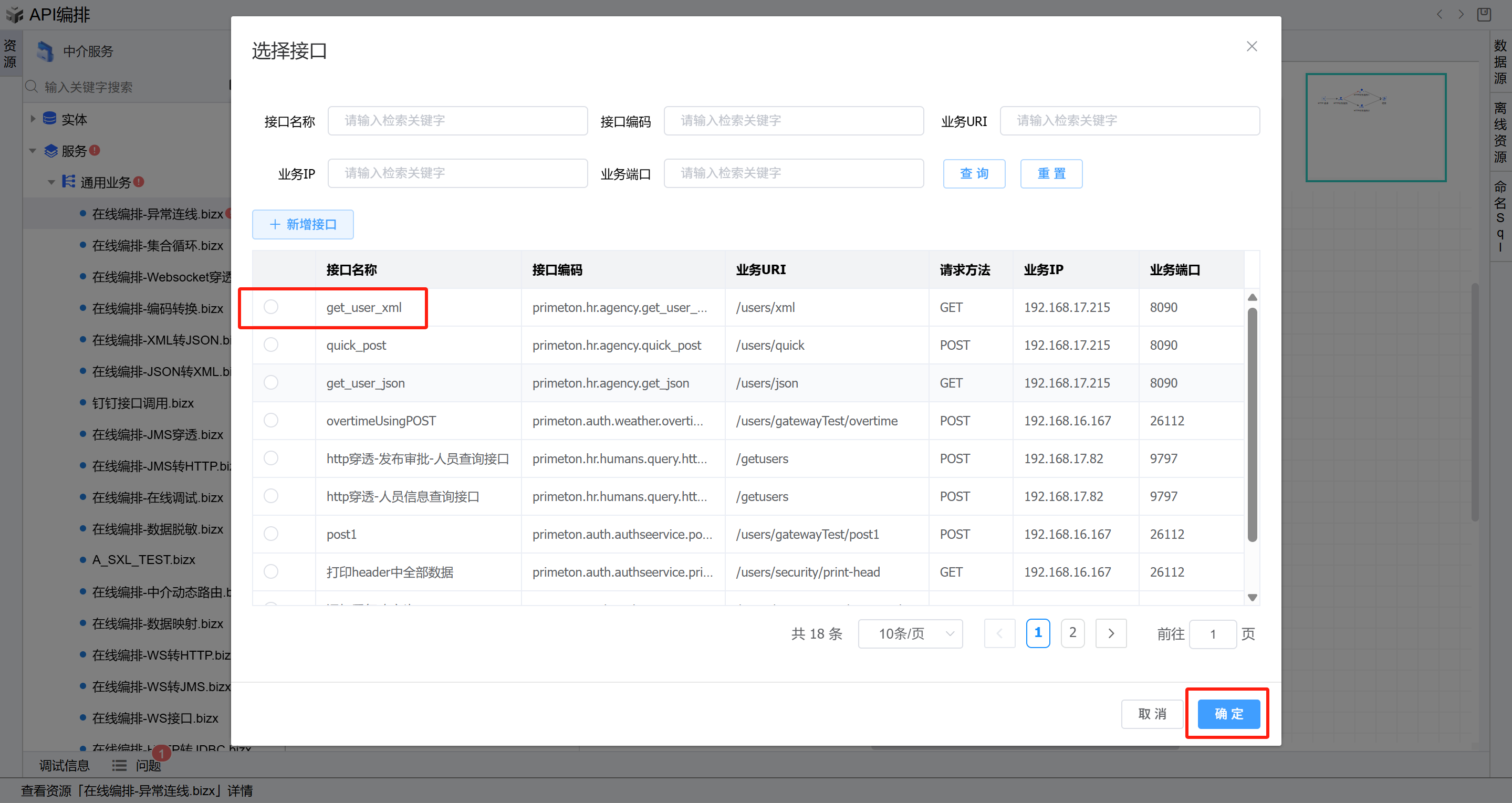 - 双击第一个HTTP业务服务图元,进入编辑页面,在业务接口右侧点击“选择”按钮,进入选择接口页面,选择前置条件中新增的