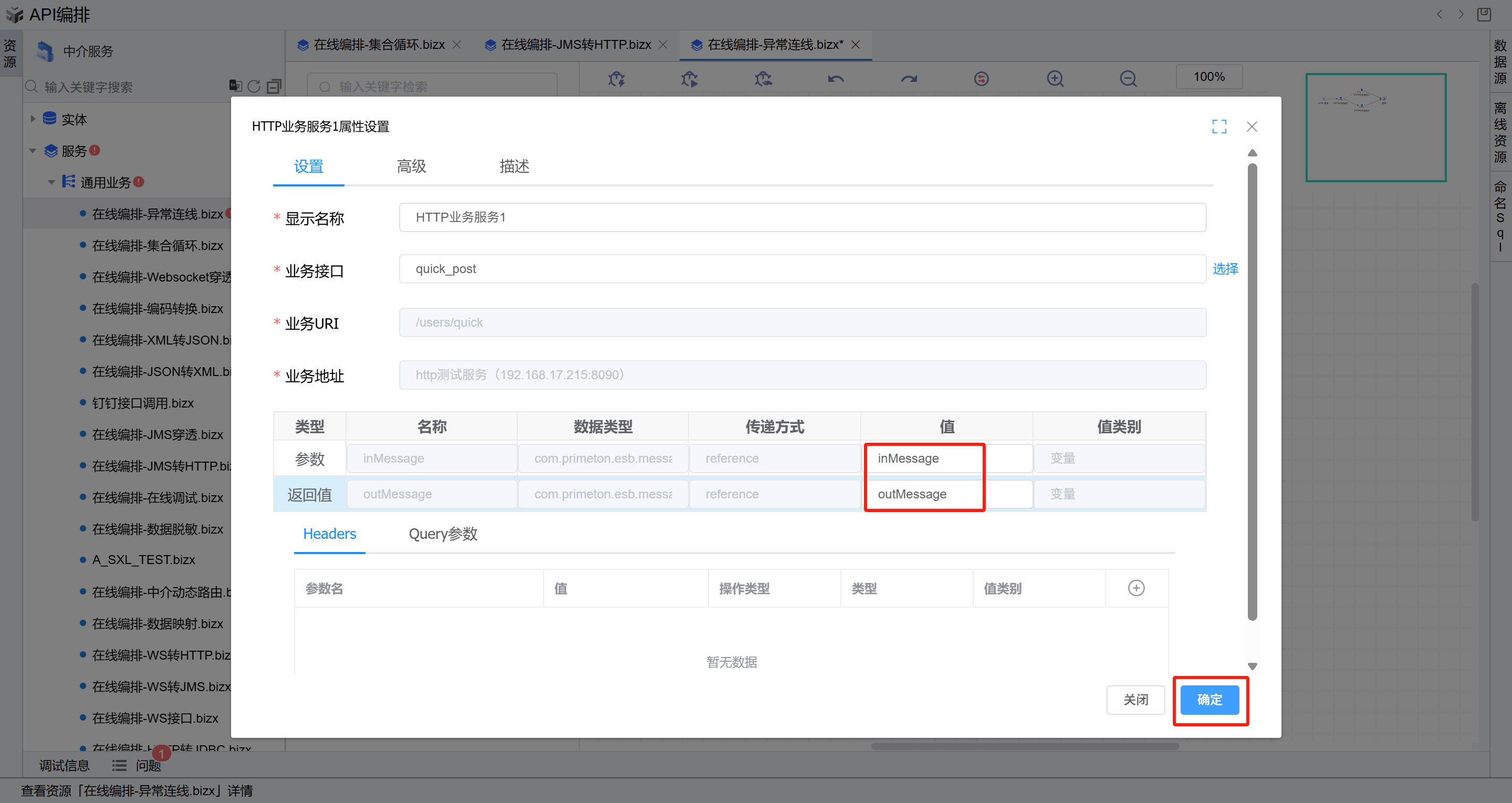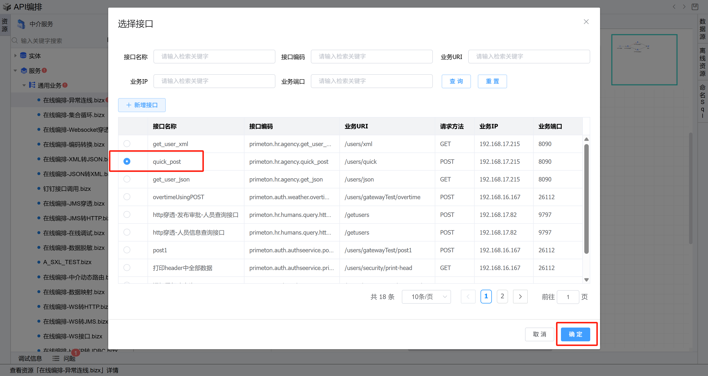 - 双击第二个HTTP业务服务图元(异常线连接的图元),进入编辑页面,在业务接口右侧点击“选择”按钮,进入选择接口页面,选择前置条件中新增的
