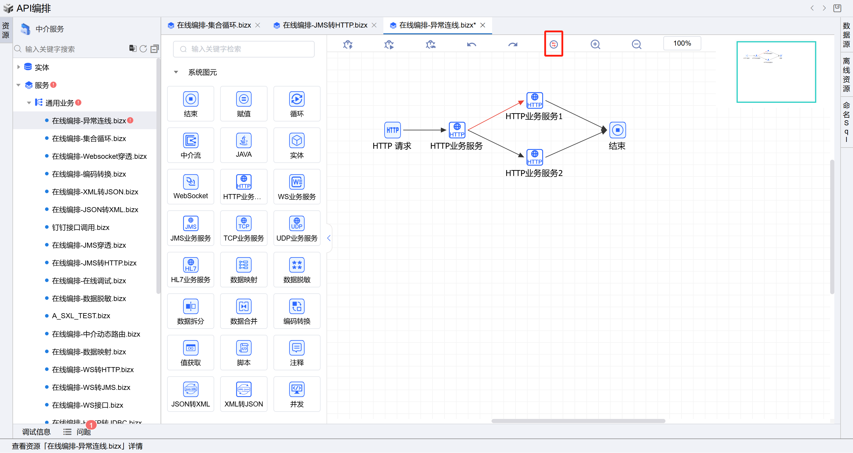 - 点击正上方的“切换为异常连线”按钮,然后将两个HTTP业务服务图元连接成异常连线。如下图: