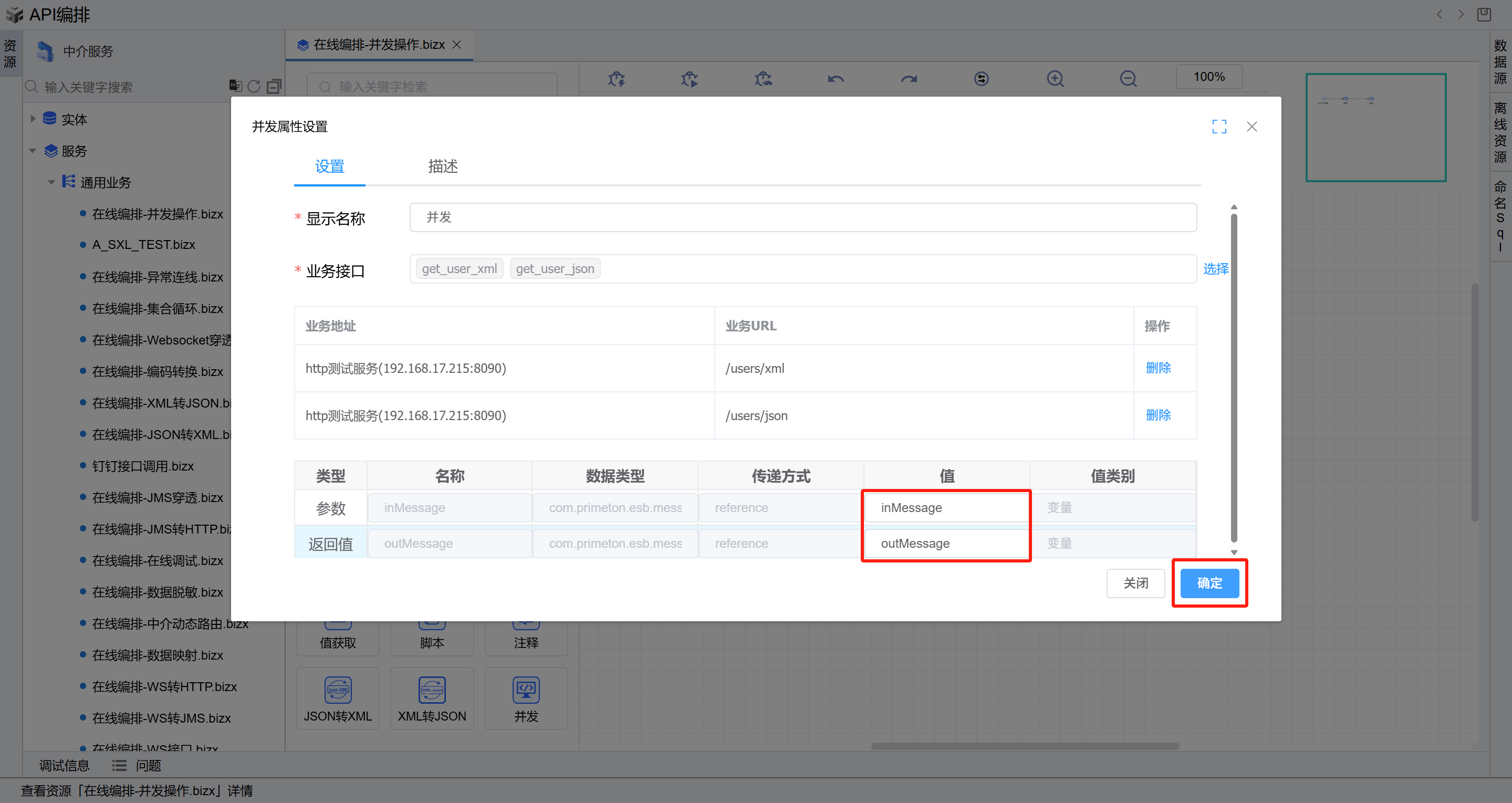 get /users/xml接口 和get /users/json接口,点击“确定”按钮回到编辑页面,在表格中的参数和返回值分别选择inMessage和outMessage,点击“确定”按钮保存。如下图: