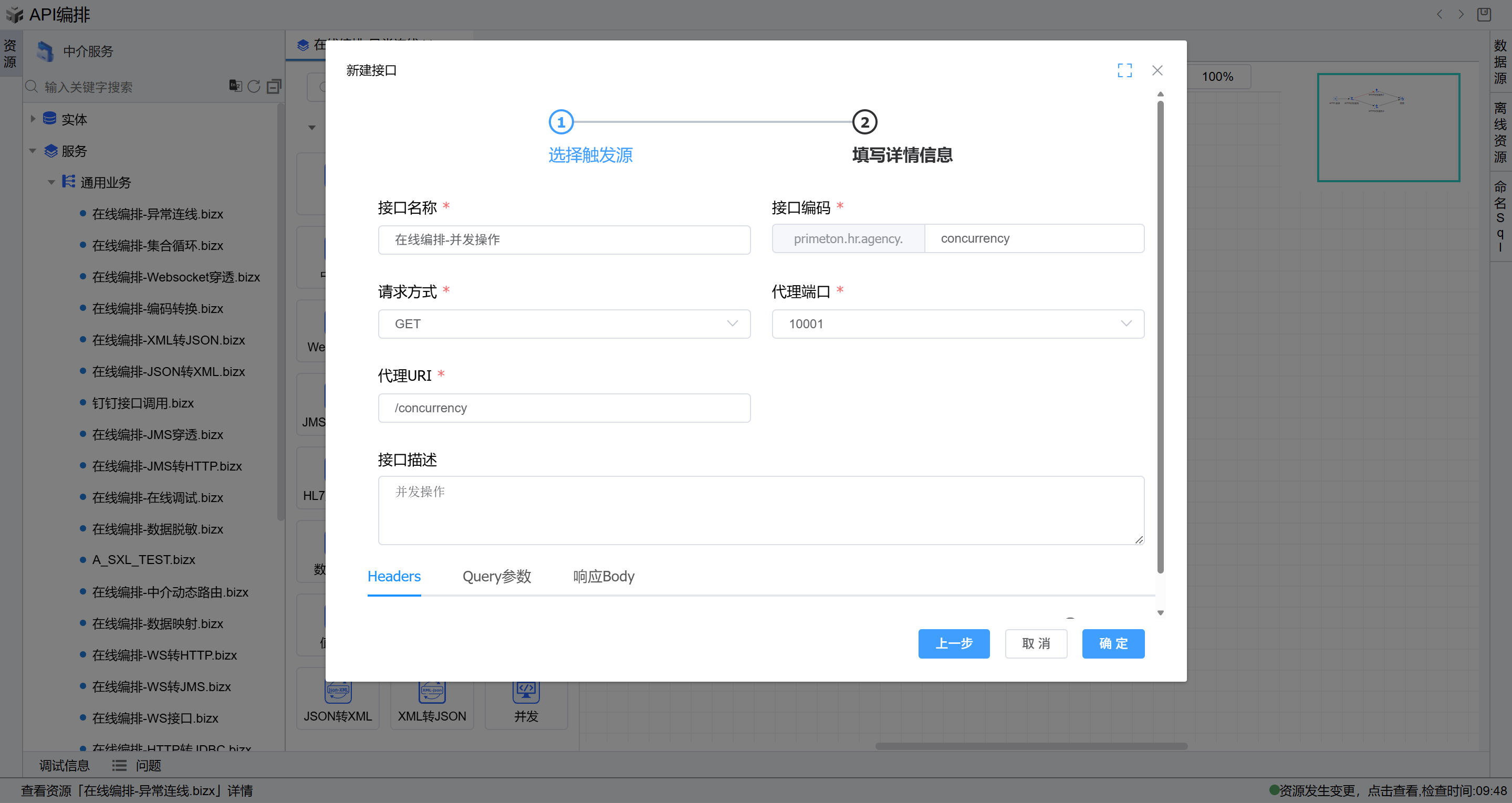 - 双击并发图元,进入编辑页面,在业务接口右侧点击“选择”按钮,进入选择接口页面,选择前置条件中新增的