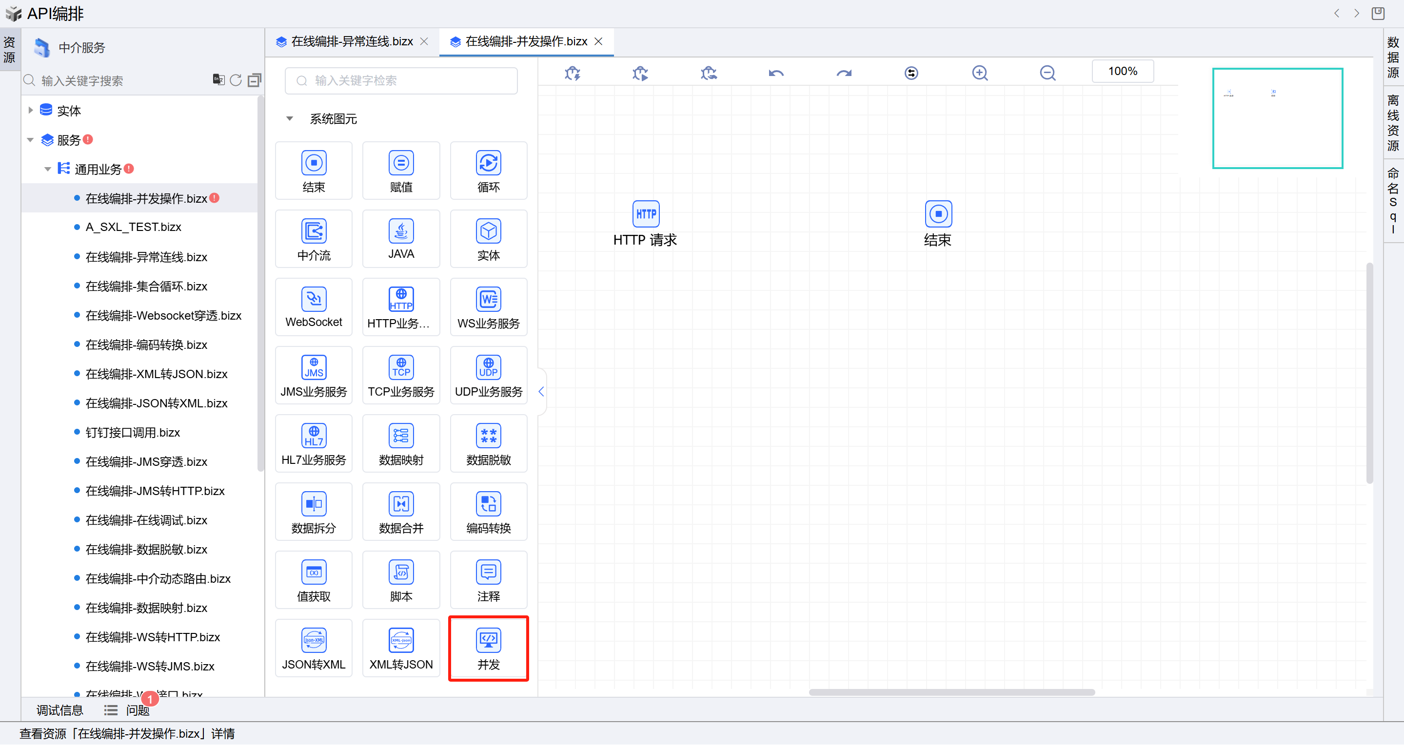 - 保存成功后系统自动打开中介编排页面,如下图所示。从左侧拖一个并发图元到开始和结束图元中间并依次连接各个图元。如下图: