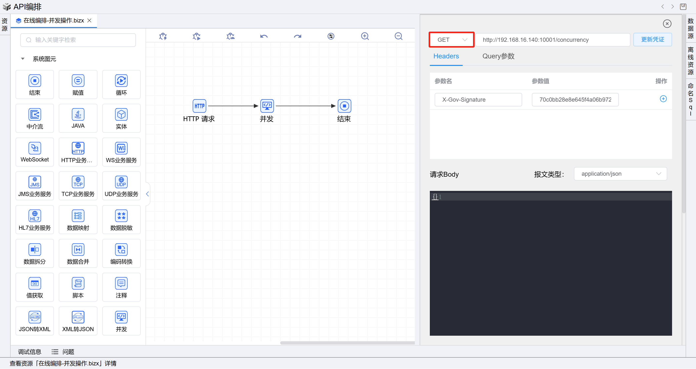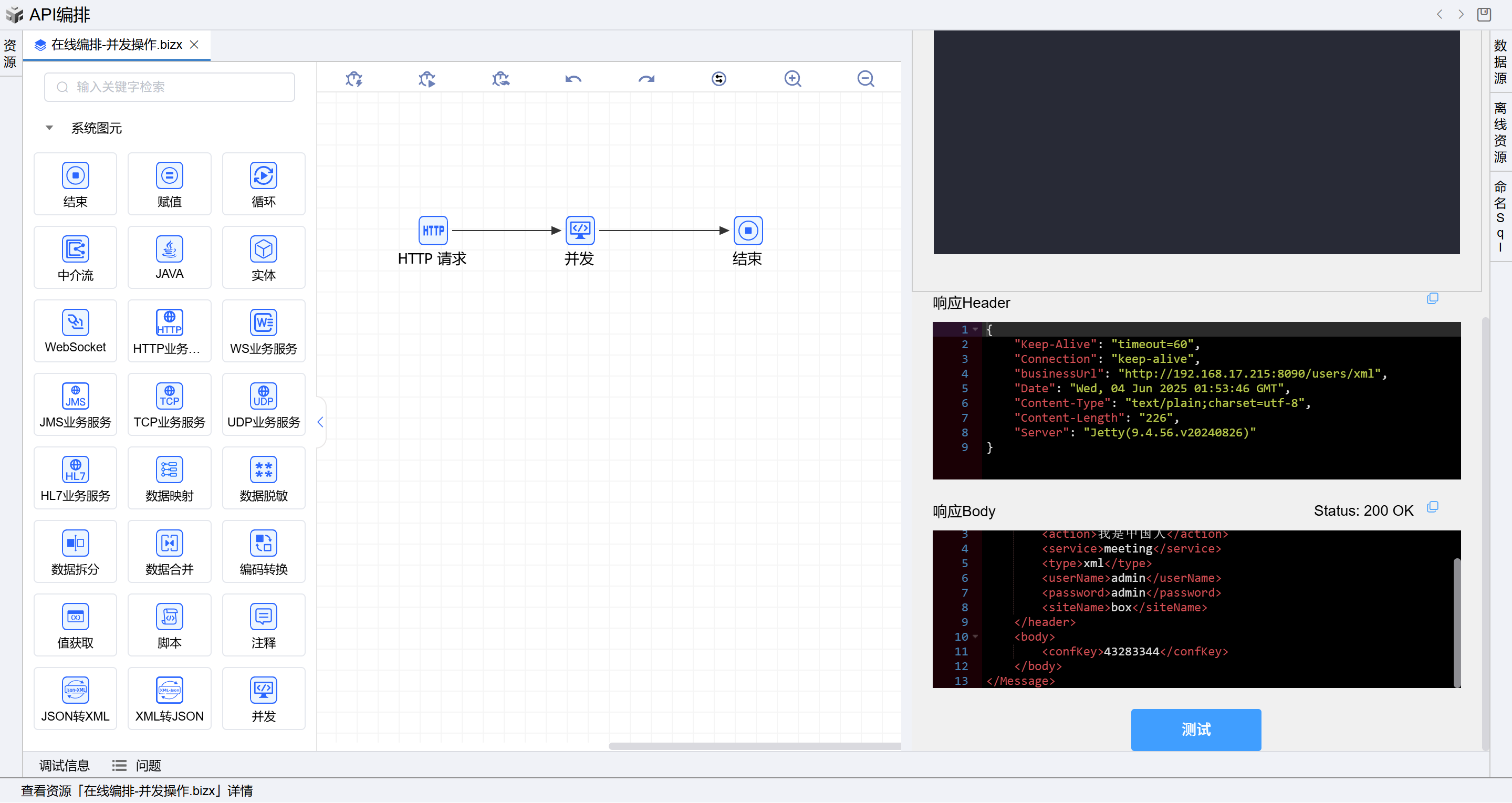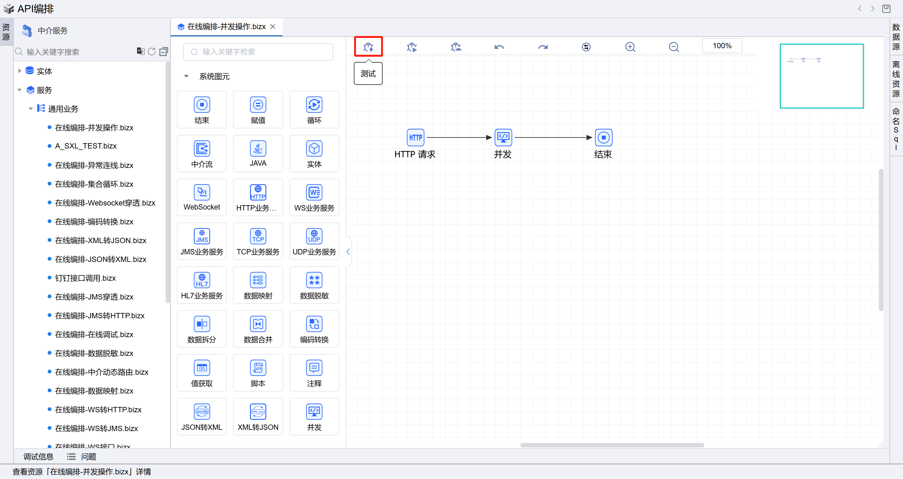 在线编排页面保存成功后,点击界面上方的测试按钮,如下图:
