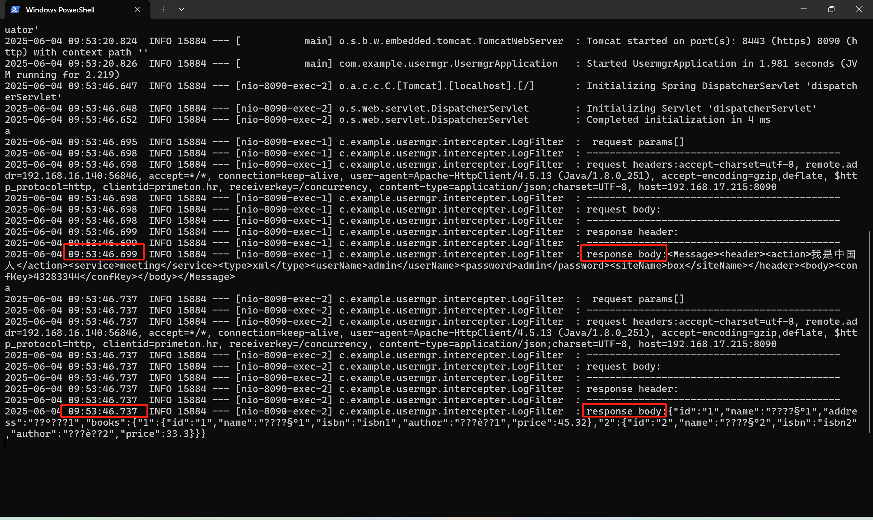 查看服务日志,可以看到两个接口调用成功的日志。如下图:
