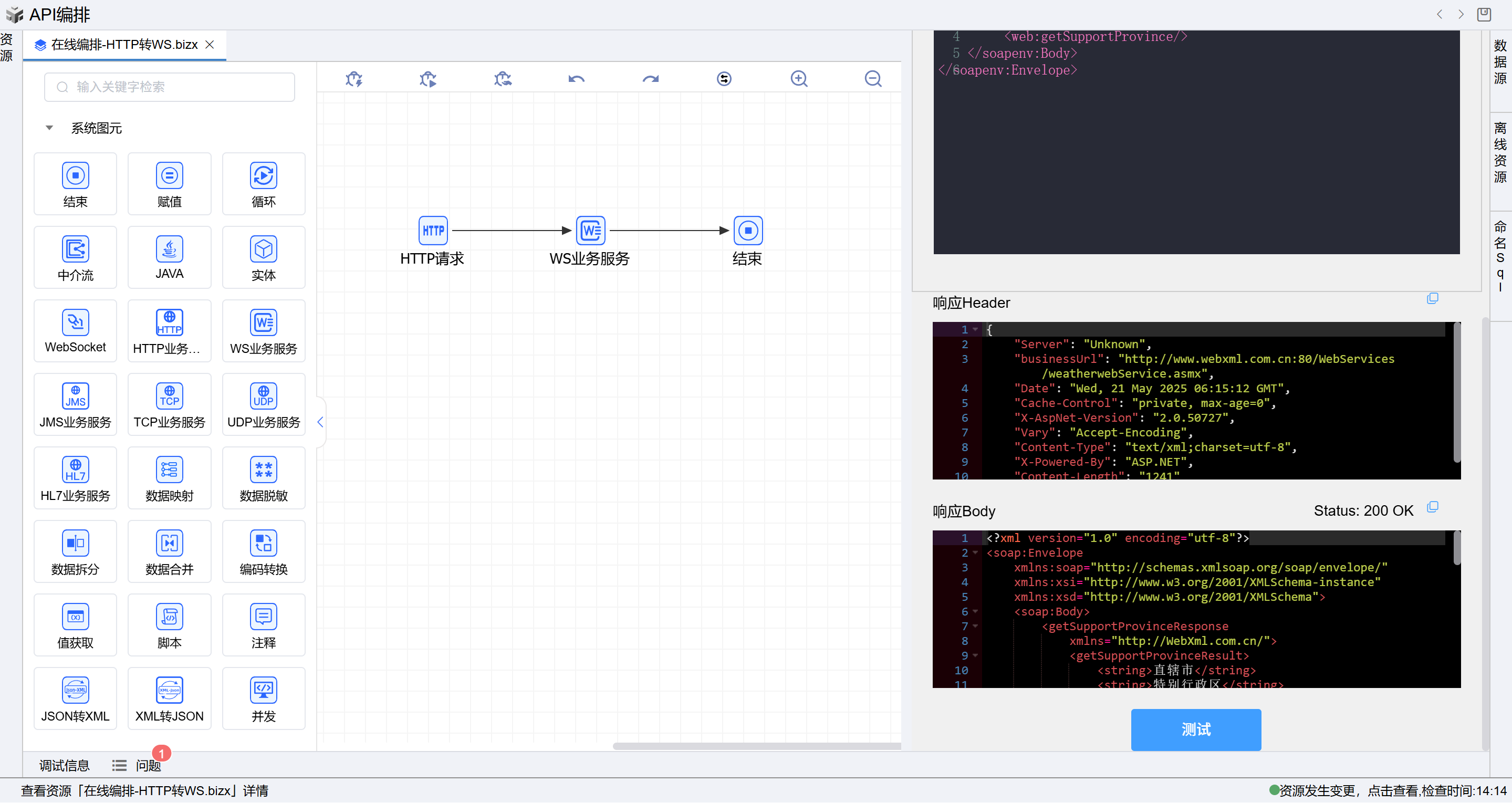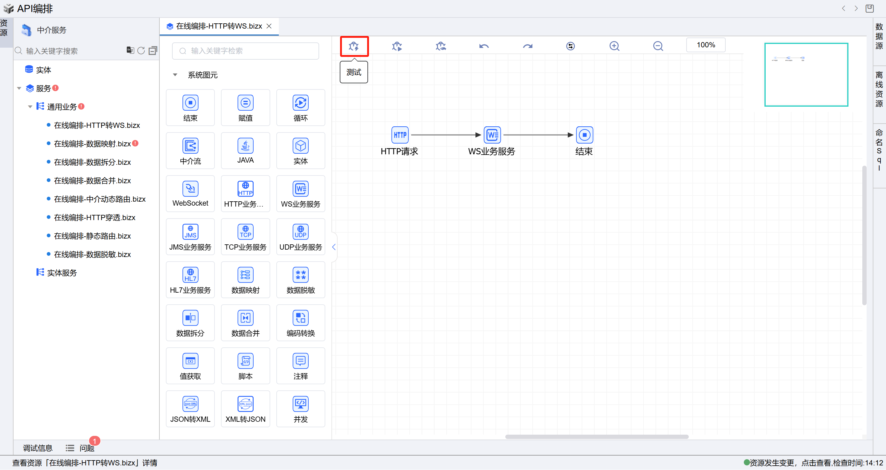 1. 在线编排页面保存成功后,点击界面上方的测试按钮,如下图:
