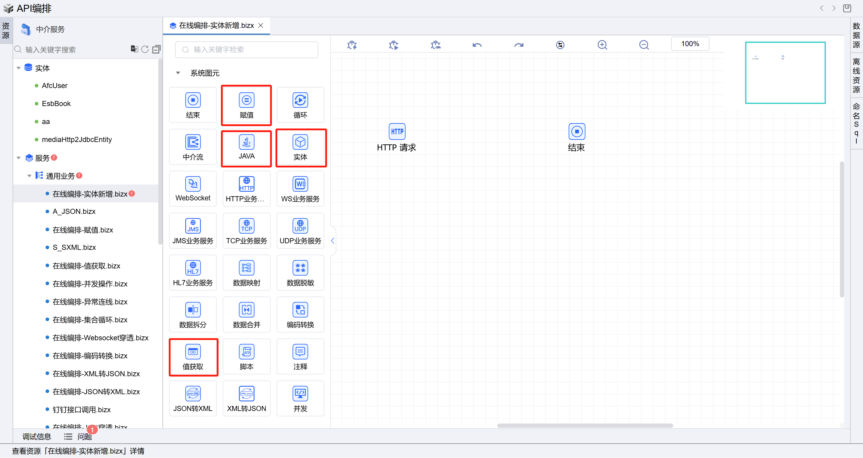 保存成功后系统自动打开中介编排页面,如下图所示。从左侧拖一个值获取图元、一个赋值图元、一个JAVA图元,单击实体图元,拖动保存实体图元到右侧画布的HTTP请求和结束图元之间,并如图所示依次连接所有图元。如下图: