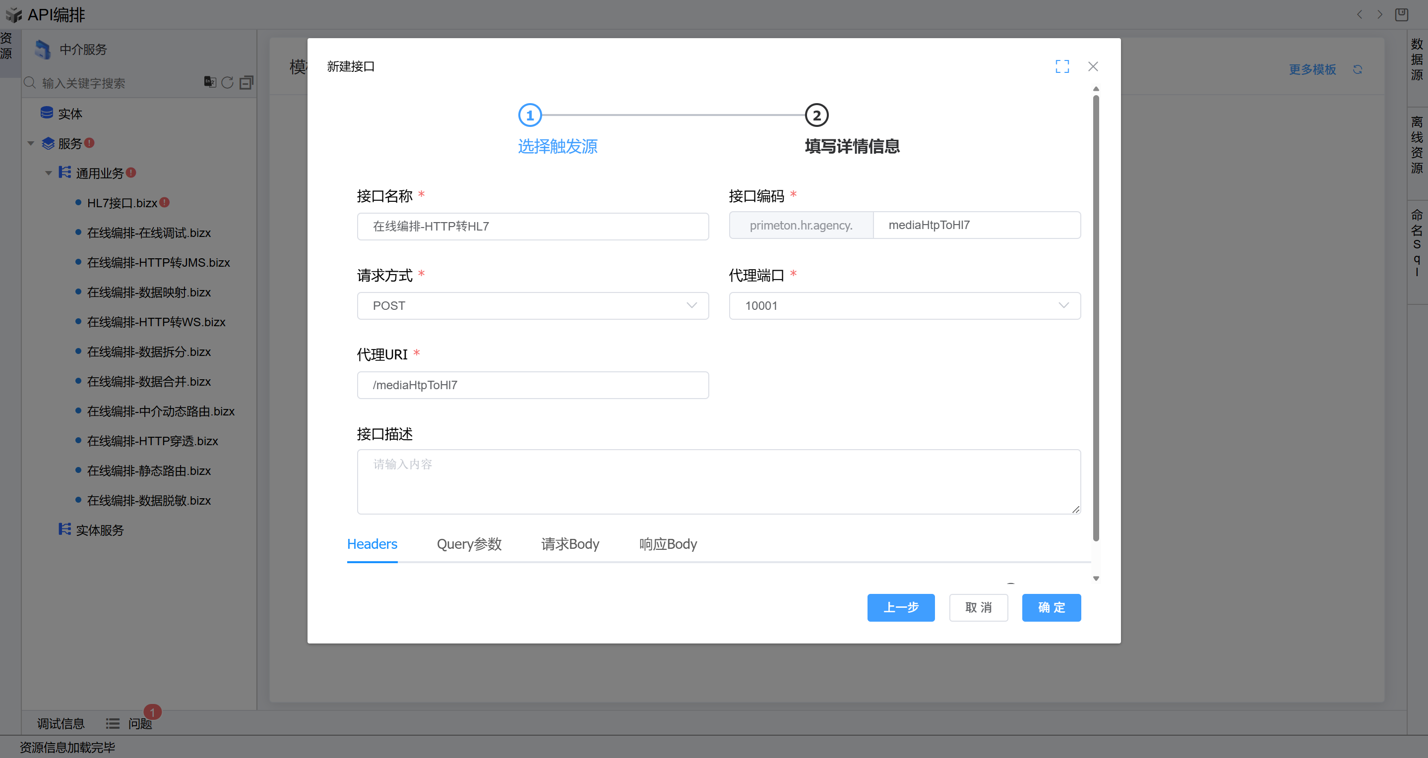 选择左侧树上中介服务节点,点击API创建按钮,选择右侧的”API编排“页签,点击”API编排“按钮,进入在线编排页面。