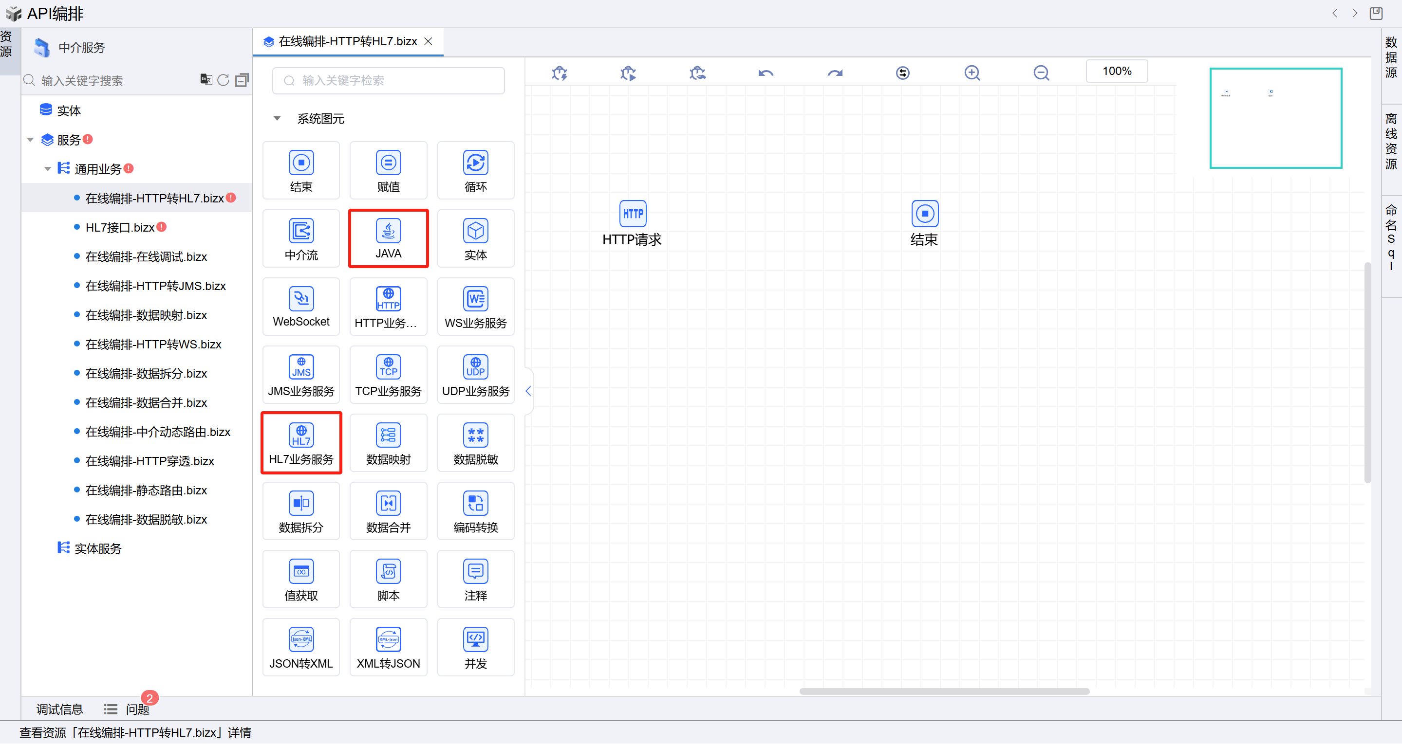 保存成功后系统自动打开中介编排页面。从左侧拖一个HL7业务服务图元和JAVA图元到开始和结束中间,并依次连接各个图元。如下图: