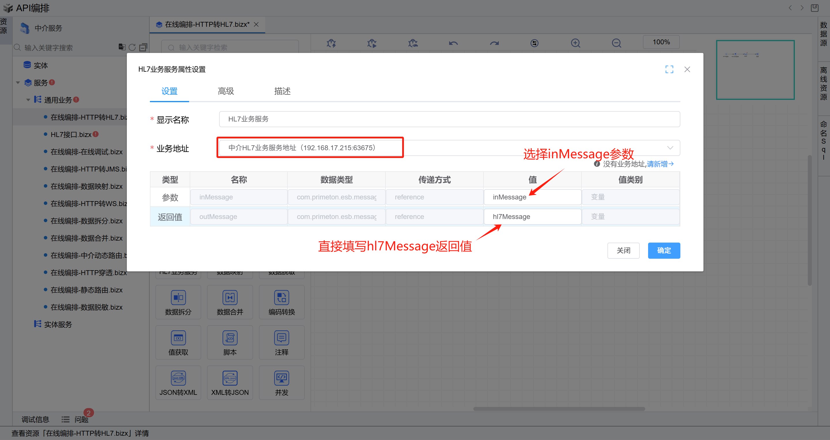 双击打开HL7业务服务图元,选择HL7业务服务地址,参数选择inMessage返回值填写hl7Message。如下图: