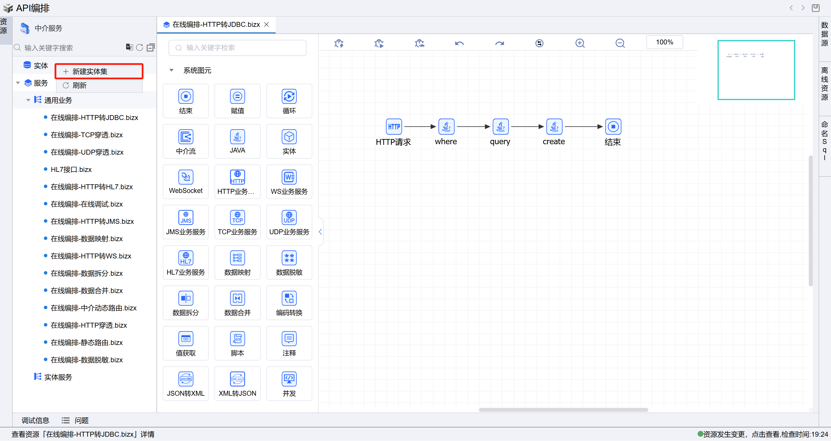 选择左侧树上中介服务节点,点击API创建按钮,选择右侧的”API编排“页签,点击”API编排“按钮,进入在线编排页面。