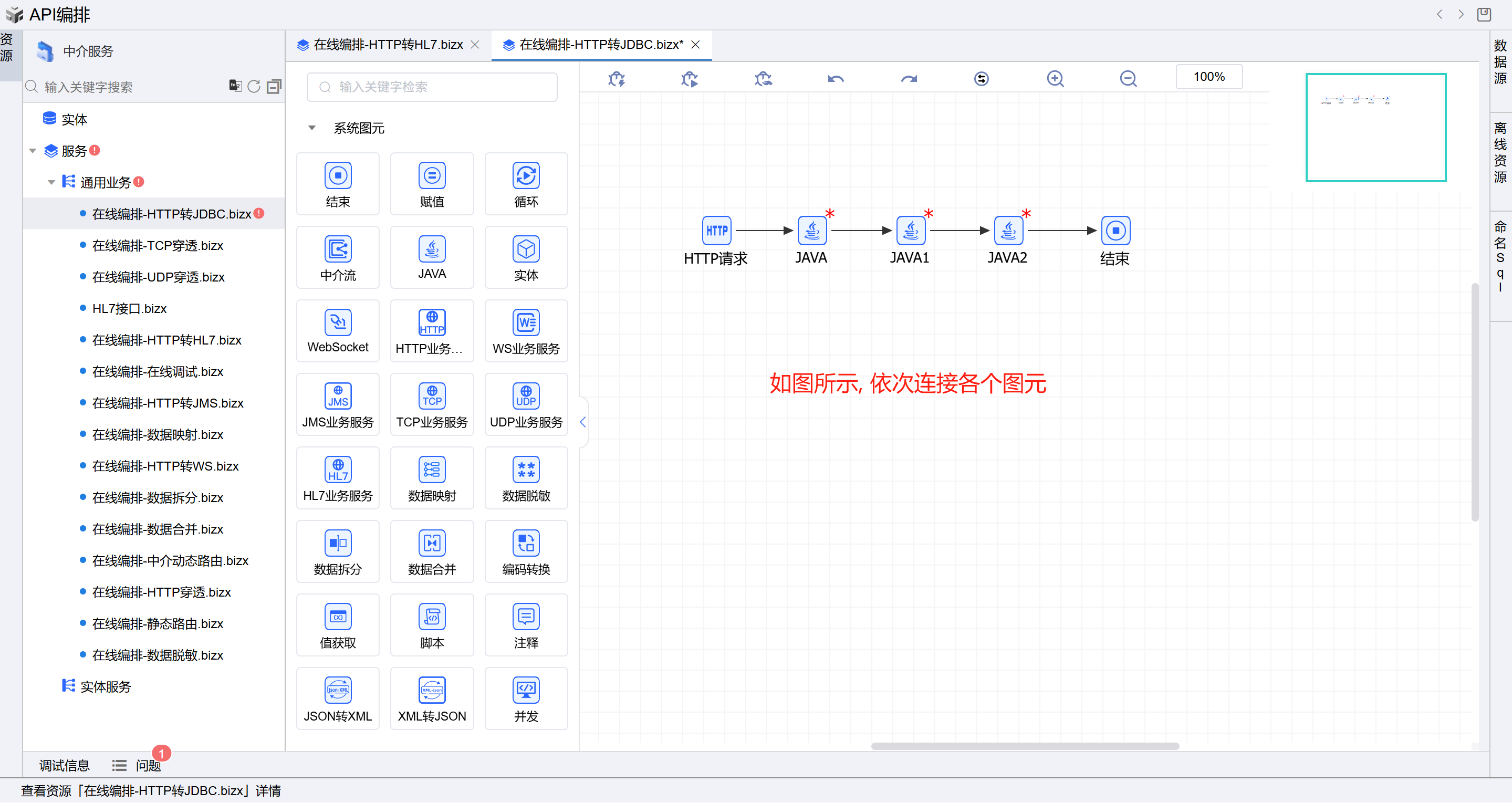 保存成功后系统自动打开中介编排页面。从左侧拖三个JAVA图元到开始和结束中间并依次连接各个图元。如下图: