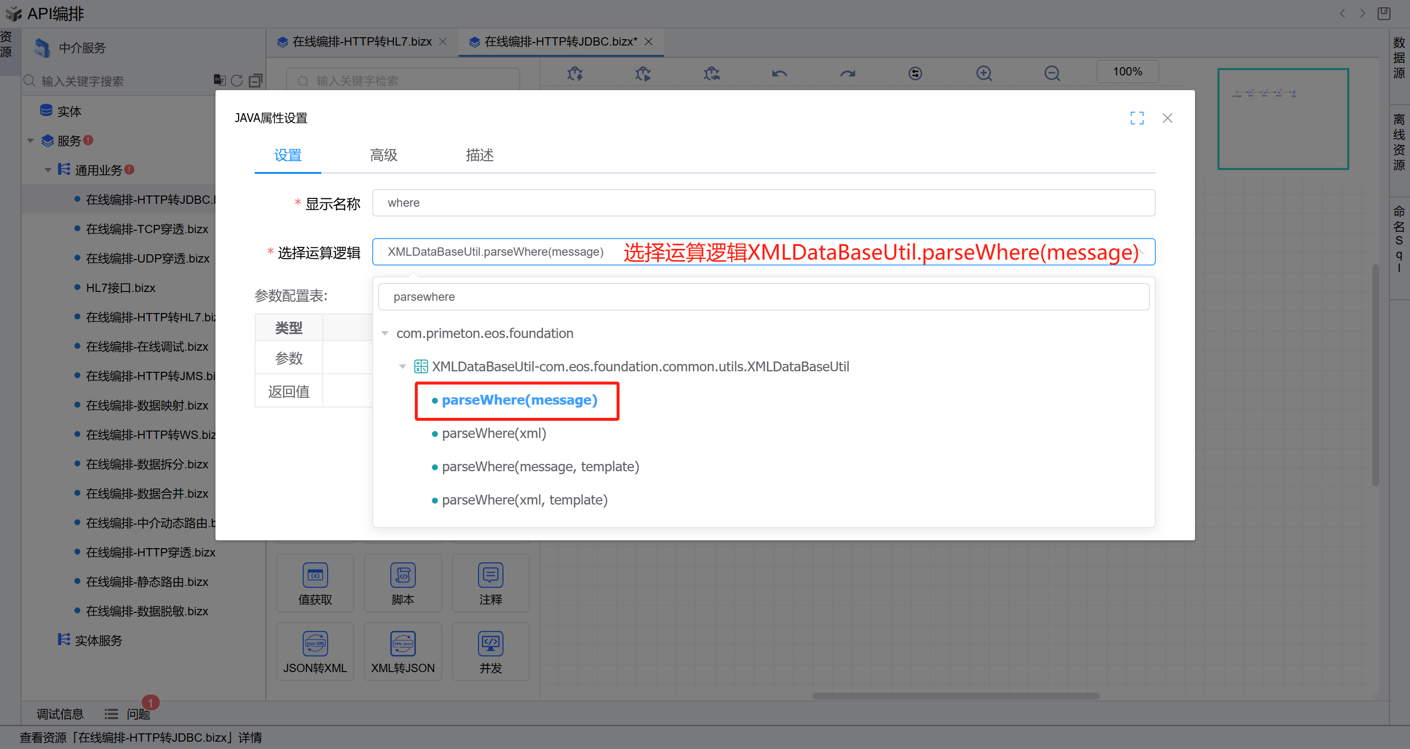打开第一个JAVA图元修改显示名称为where,选择运算逻辑XMLDataBaseUtil.parseWhere(message)方法,输入参数是ITipMessagePayload类型的inMessage,输入参数是DataObject类型的data。如下图: