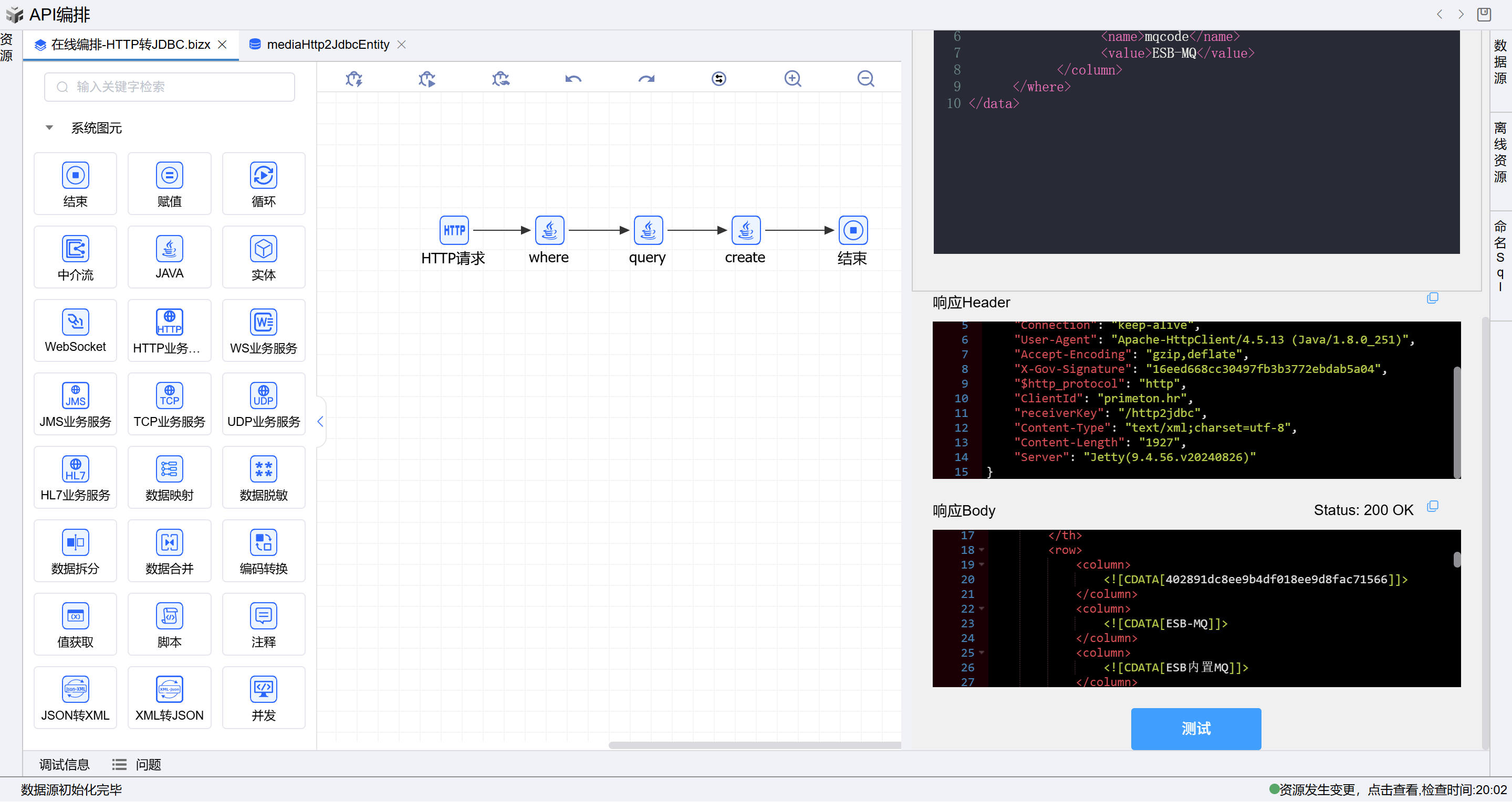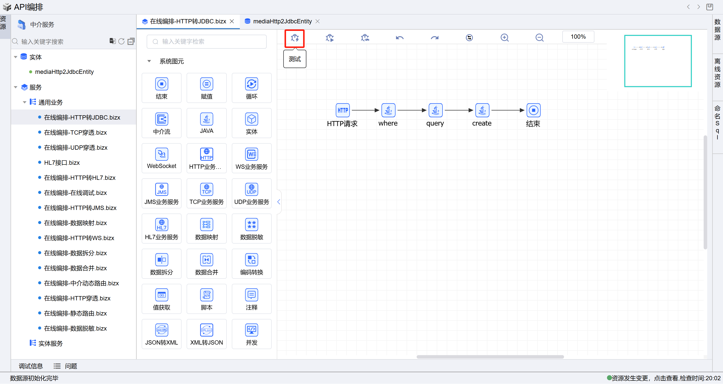 1. 在线编排页面保存成功后,点击界面上方的测试按钮,如下图: