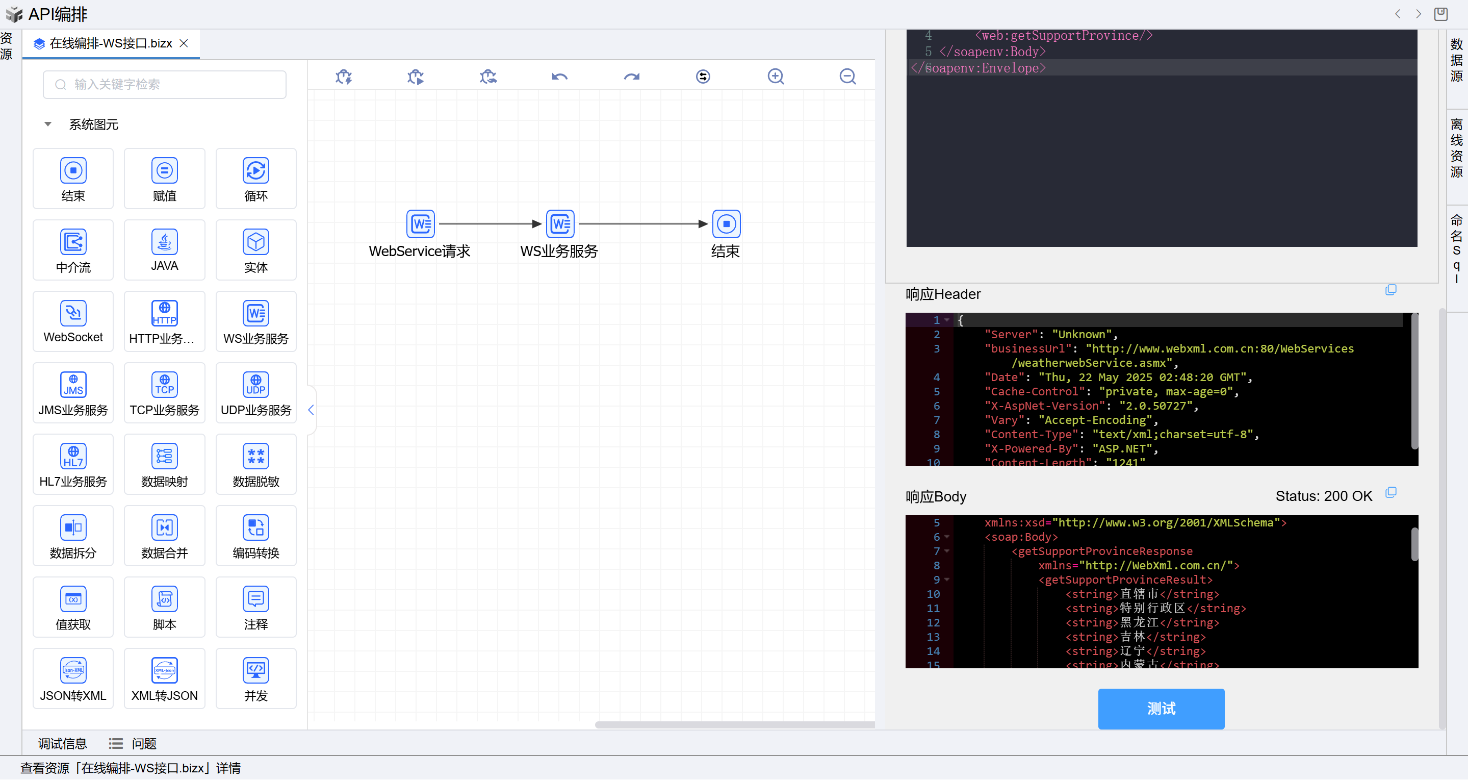 在线编排页面保存成功后,点击界面上方的测试按钮,如下图: