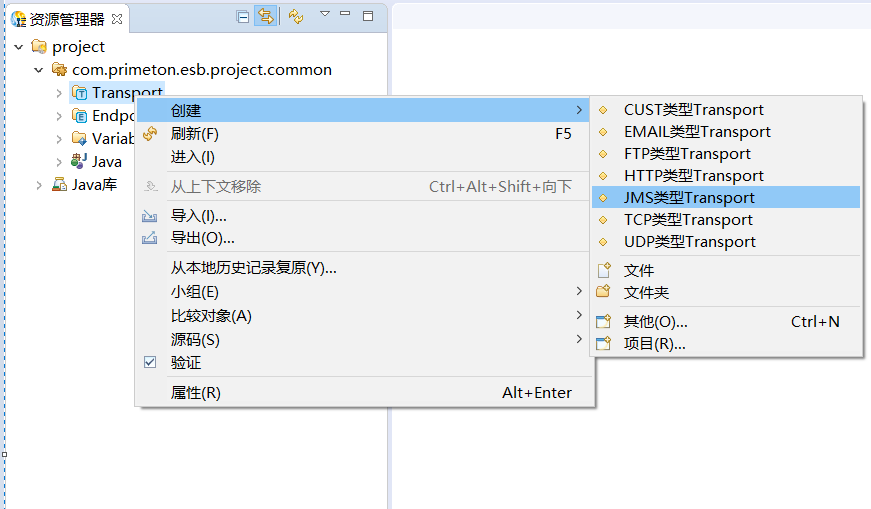 在资源管理器中,右键点击公共Module中"Transport",选择"创建->JMS类型Transport"菜单项,如下图所示: