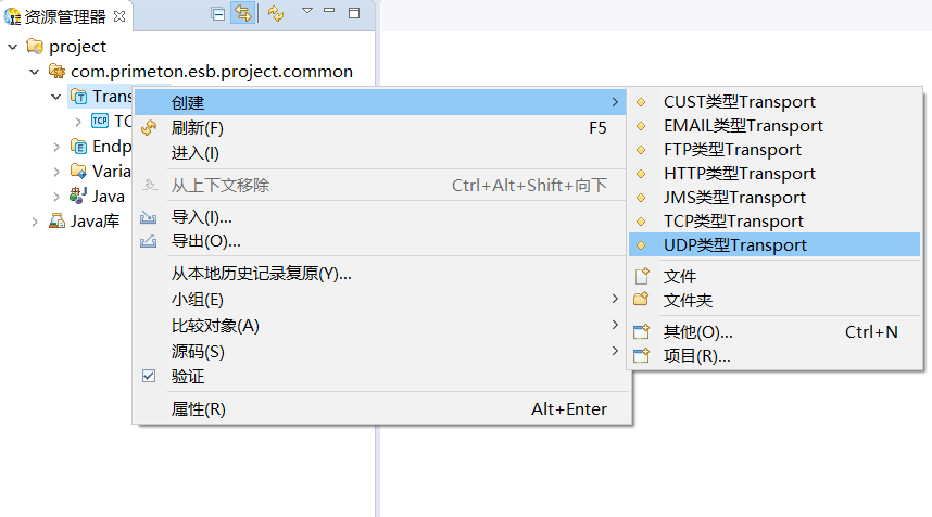 创建的ESB工程中,在资源管理器中,选择"Transport"菜单项,点击右键,选择"创建->UDP类型Transport",如下图所示: