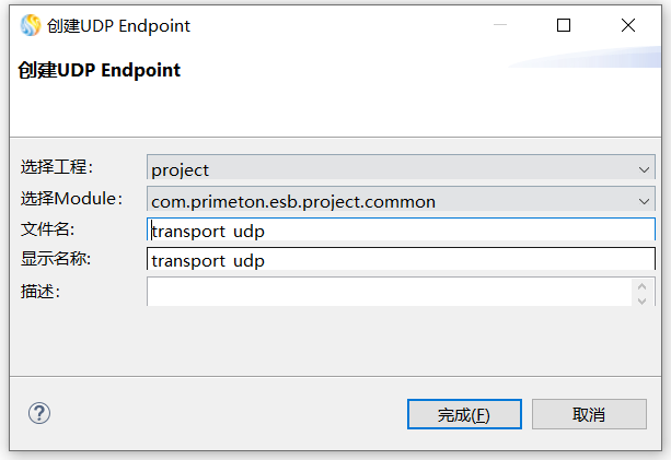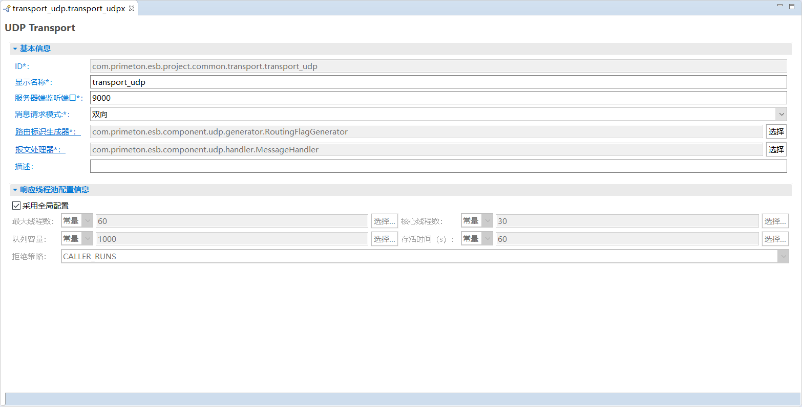 - 文件名:用于存储UDP Transport配置的文件名。需要保证在ESB工程中唯一。