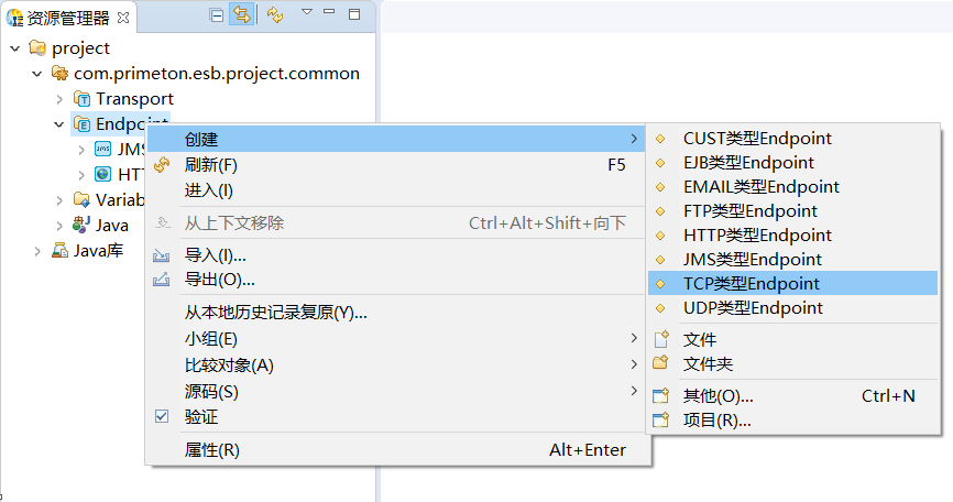 在资源管理器中,选中新建的公共Module的Endpoint,点击右键,选择"创建->TCP类型的Endpoint"菜单项,创建TCP类型的Endpoint,如下图所示: