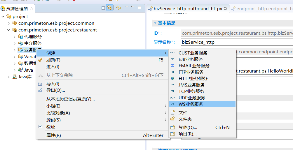 1. 在资源管理器中,右键点击业务Module中的"业务服务",选择"创建->WS业务服务" 菜单项,如下所示: