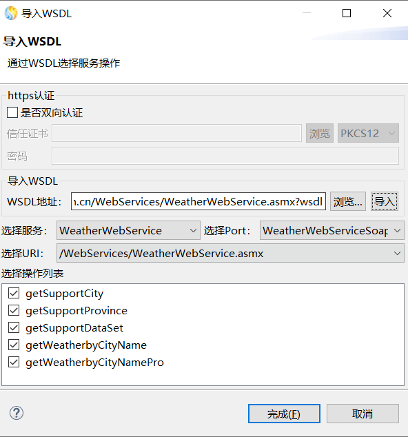 如果导入的wsdl文件没有错误选择服务、选择port、选择url等信息会自动填充