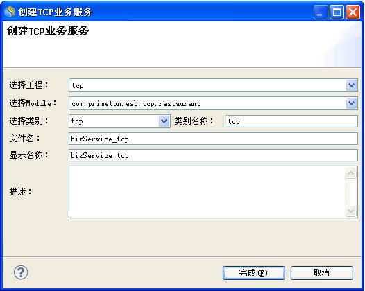 在弹出的"创建TCP业务服务"向导中输入创建TCP业务服务的各选项,点击"完成"按钮生成TCP业务服务。