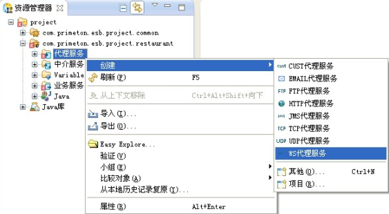 1. 在资源管理器中右键点击业务Module中的代理服务,选择"创建->WS代理服务" 菜单项。