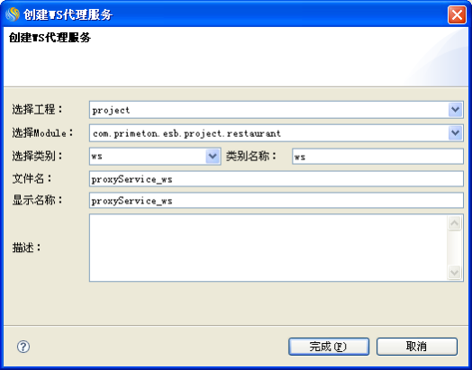 2. 在弹出的"创建WS代理服务"向导中输入相应信息点击"完成"按钮生成WS代理服务。