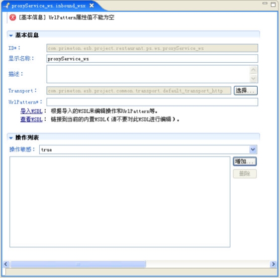 1. 编辑新建的WS代理服务。 4.1 新建的WS代理服务缺少其它必要信息,如URLPattern为空提示:"URLPattern属性值不能为空",显示如下: