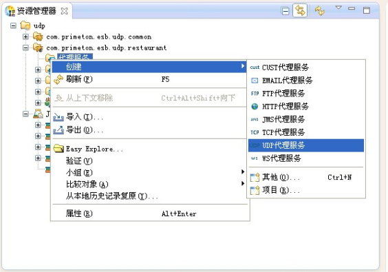 1. 在资源管理器中,右键点击业务Module的代理服务项,在弹出的菜单中选择"创建->UDP代理服务",如下图所示:
