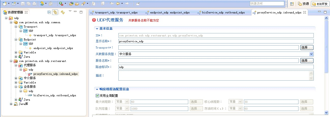 新生成的UDP代理服务缺少其它必要信息,如访问URL、关联的业务服务(或代理服务),并在上图中显示为存在编译错误。