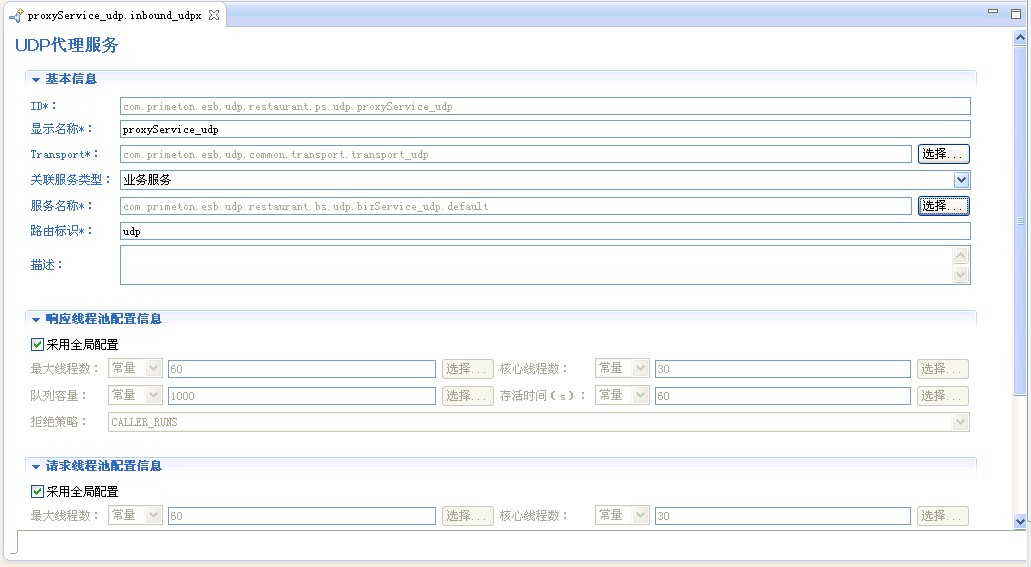 • Transport:UDP代理服务关联的Transport,即UDP代理服务所处理请求的来源。系统运行中,Transport完成请求的接入,然后交予UDP代理服务处理。ESB工程创建时,在公共Module中自动生成缺省的UDP Transport,UDP代理服务选择缺省的UDP Transport即可。