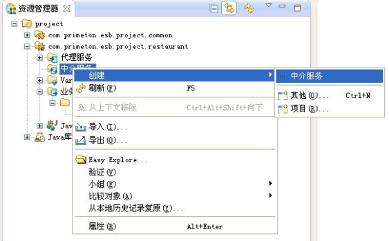 在资源管理器中,选中新建的业务Module的"中介服务"项,点击右键,选择"创建→中介服务"菜单项,创建中介服务,如下图所示: