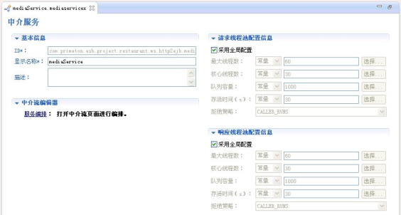 注意:步骤7中参数的"返回值"和步骤9中的"参数",由于Java图元的返回至是下一个图元的输入参数,所以参数值"outMsg"一定要对应一致,否则会出错。 至此,中介服务创建完成。